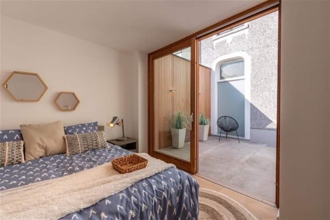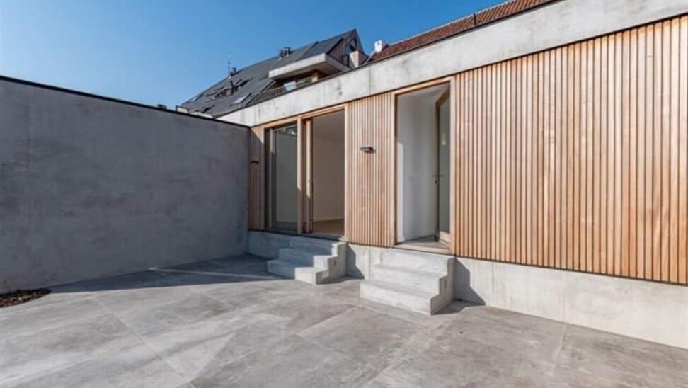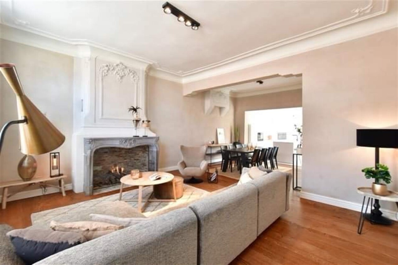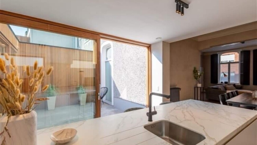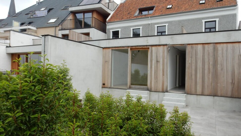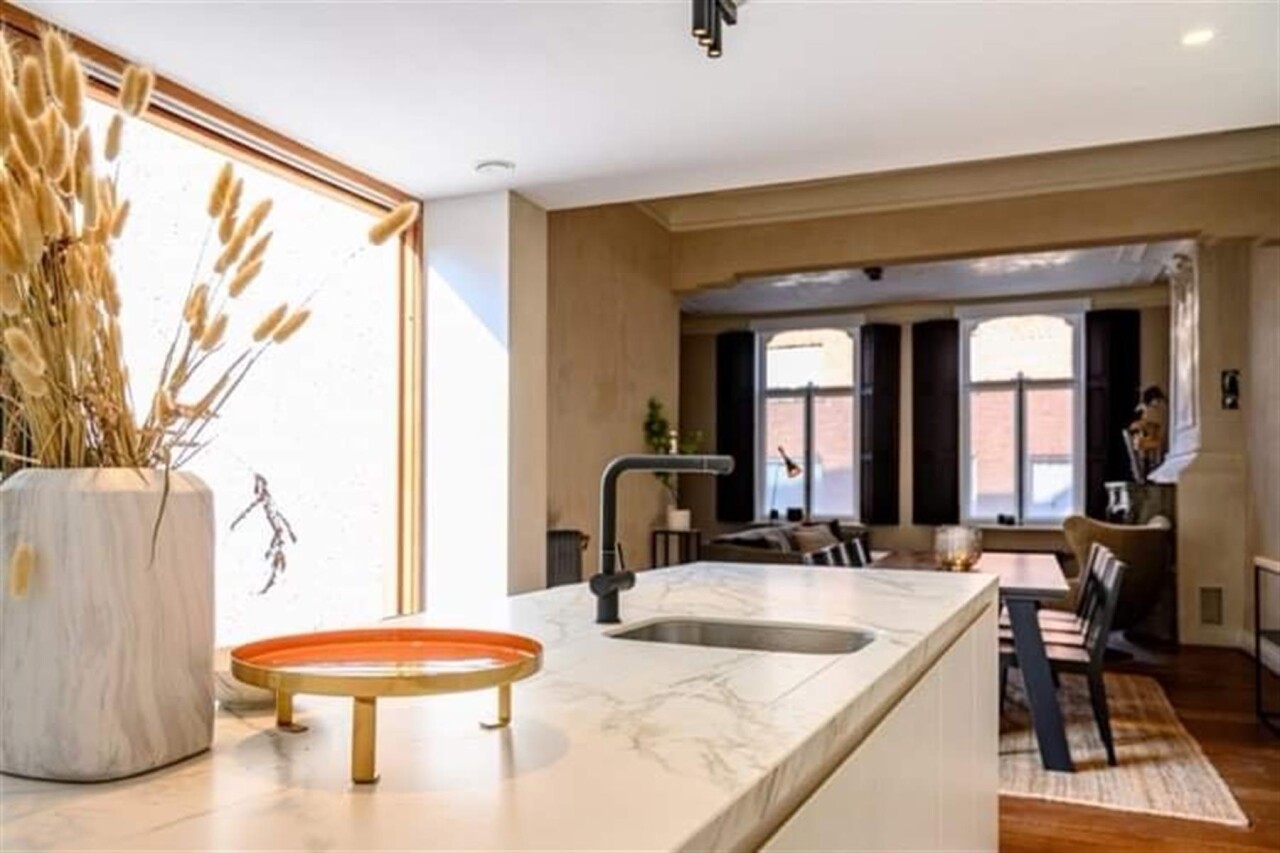 Binnenkomen doe je via de oorspronkelijke hall in de herenwoning, maar kan ook vlot via de doorgang naar tuin. De zitruimte en eetplaats bevinden zich in de oorspronkelijke woning. In een nieuwe strakke uitbouw ligt aansluitend de volledig ingerichte keuken (met tal van ingemaakte kasten en kwaliteitstoestellen waaronder inductiekookplaat, vaatwasser, klassieke oven, microgolf, Liebherr wijnklimaatkast...). Een schuifraam geeft hier uit op de patio die voor een aangename lichtinval zorgt. Achterin is er de hall met gastentoilet, twee slaapkamers met parketvloer, de badkamer met lavabomeubel en inloopdouche en een berging/wasplaats. De hall en één van de slaapkamers geven uit op het terras dat alle privacy geeft. Via het terras loop je de tuin in en bereik je de eigen staanplaats en garage.