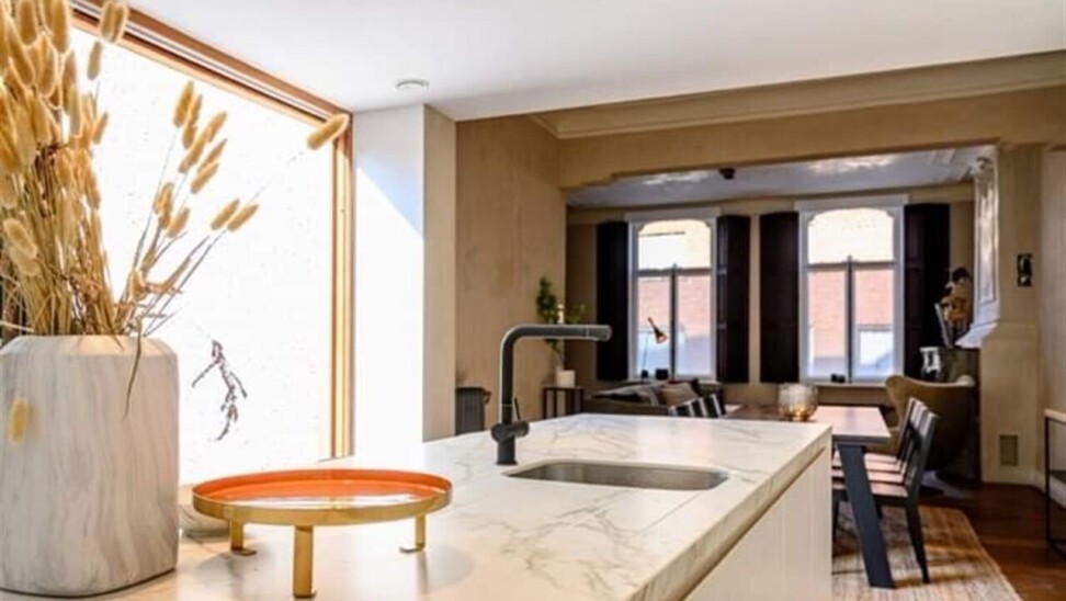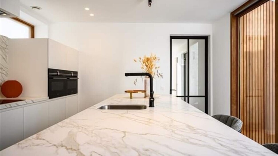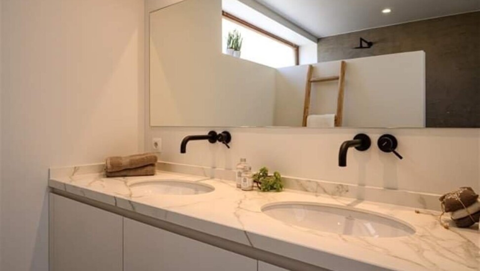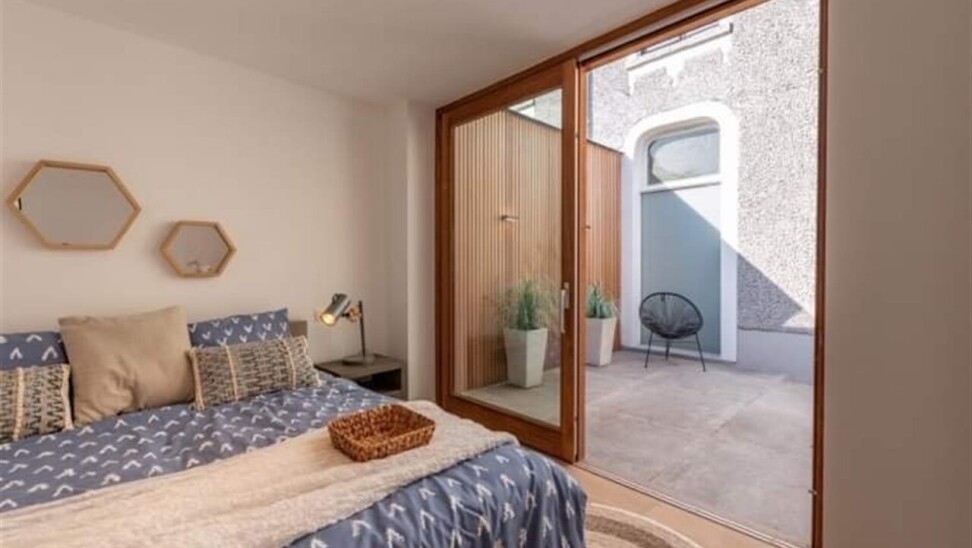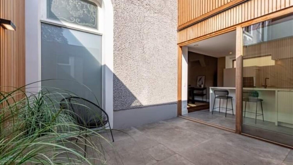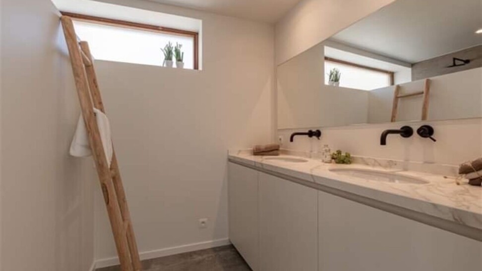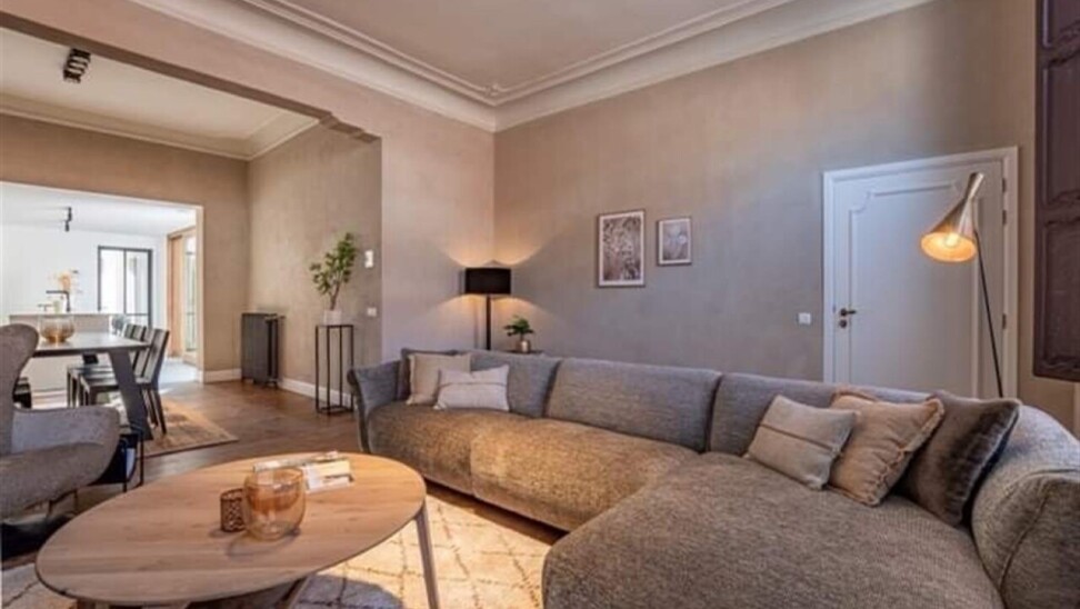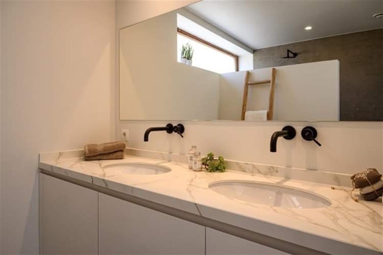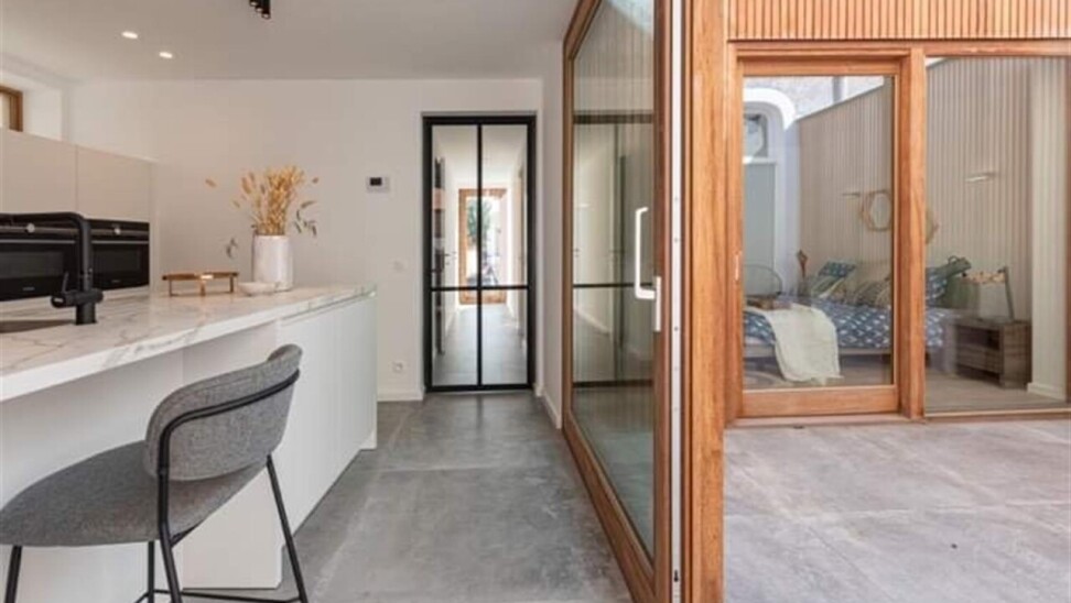 Binnenkomen doe je via de oorspronkelijke hall in de herenwoning, maar kan ook vlot via de doorgang naar tuin. De zitruimte en eetplaats bevinden zich in de oorspronkelijke woning. In een nieuwe strakke uitbouw ligt aansluitend de volledig ingerichte keuken (met tal van ingemaakte kasten en kwaliteitstoestellen waaronder inductiekookplaat, vaatwasser, klassieke oven, microgolf, Liebherr wijnklimaatkast...). Een schuifraam geeft hier uit op de patio die voor een aangename lichtinval zorgt. Achterin is er de hall met gastentoilet, twee slaapkamers met parketvloer, de badkamer met lavabomeubel en inloopdouche en een berging/wasplaats. De hall en één van de slaapkamers geven uit op het terras dat alle privacy geeft. Via het terras loop je de tuin in en bereik je de eigen staanplaats en garage.