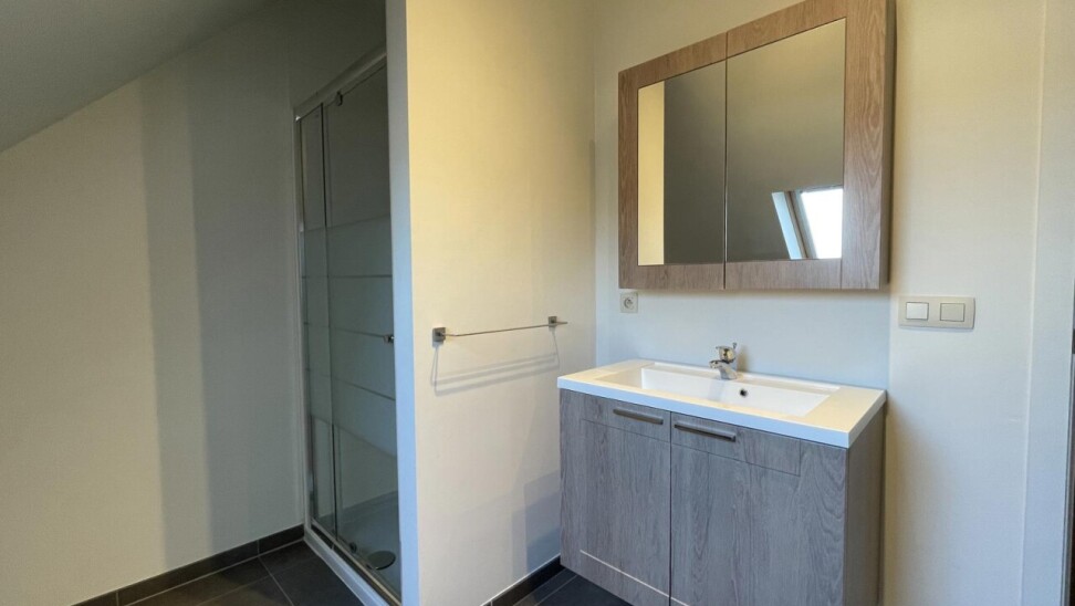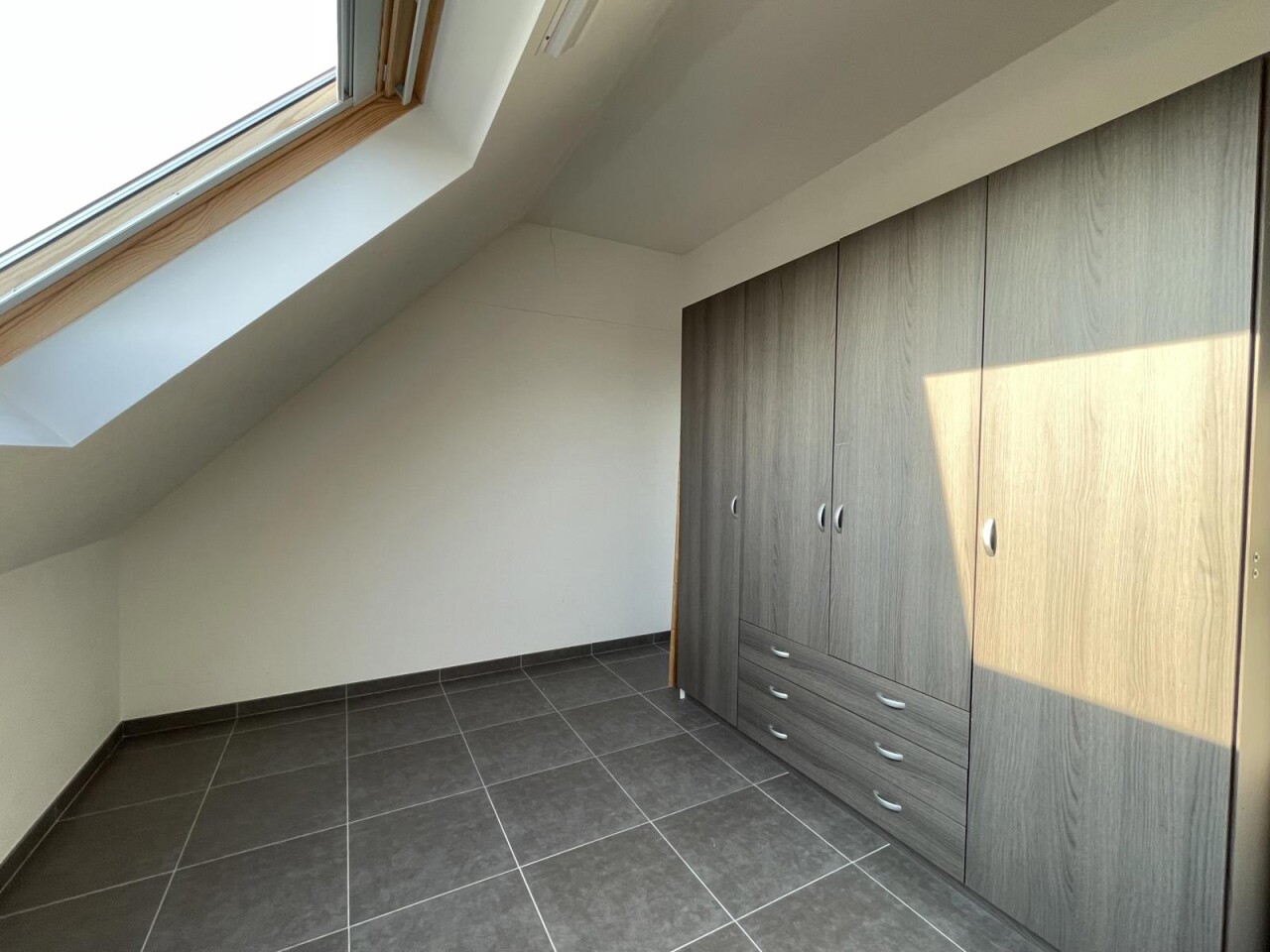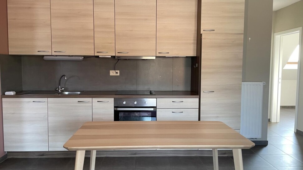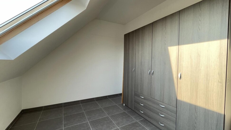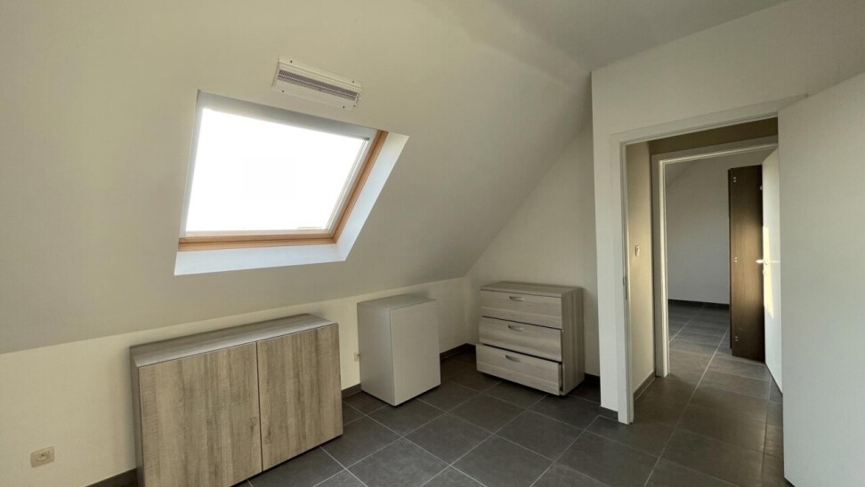 INDELING: lichtrijke leefruimte met een schuifraam dat uitgeeft op een groot terras met open zicht, ingerichte open keuken (met enkele spoeltafel, keramische kookplaat, dampkap, oven, koelkast met diepvriesvak), toilet, badkamer (met douche en lavabomeubel), twee slaapkamers en een berging/wasplaats. Er is een staanplaats achter het gebouw.
