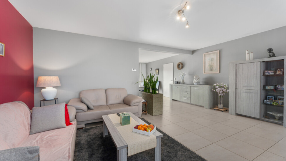 INDELING: hall met gastentoilet, aangenaam ruime en heldere leefruimte (ca. 46 m²) waar een zithoek en en eetplaats kunnen worden ingericht en met achterin de ingerichte open keuken (met kasten, dampkap, frigo, oven en keramische kookplaat.). Aansluitend bij de keuken is er een voorraadberging. Het schuifraam achteraan geeft uit op het zonnige terras. Er zijn twee slaapkamers en de badkamer heeft een lavabomeubel en een douche op het bad.