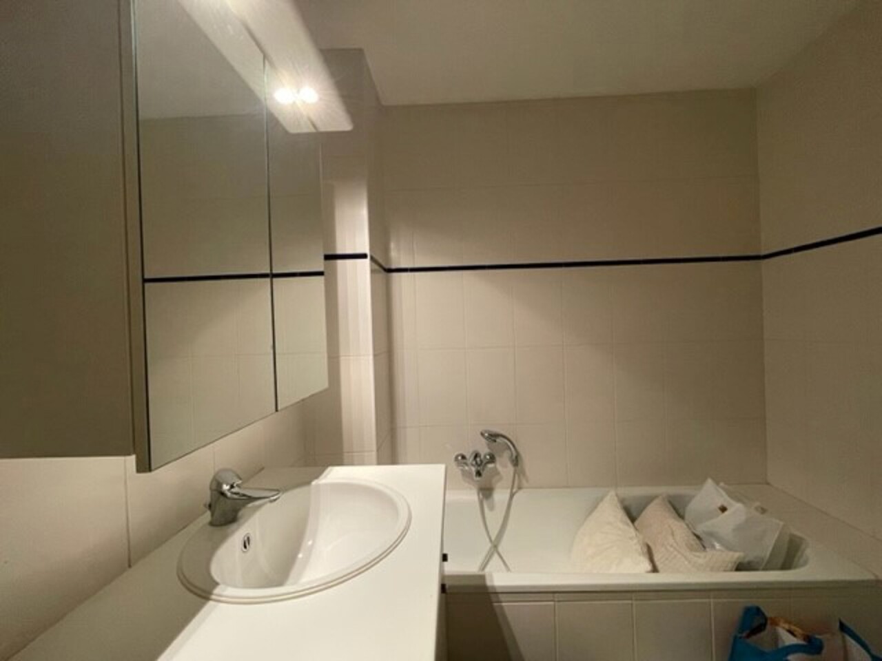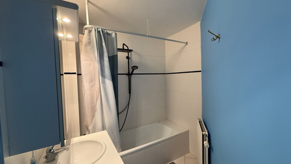 Inkomhal, open vestiaire, toilet, living, ingerichte keuken ( kasten, dampkap, koelkast, oven, vitro keramische kookplaat), ingerichte badkamer (ligbad, lavabomeubel) , 1 slaapkamer, terras, rechtstreekse toegang tot garage, gelijkvloerse berging.