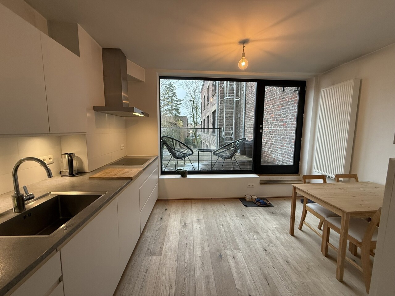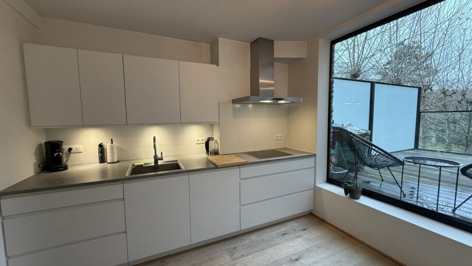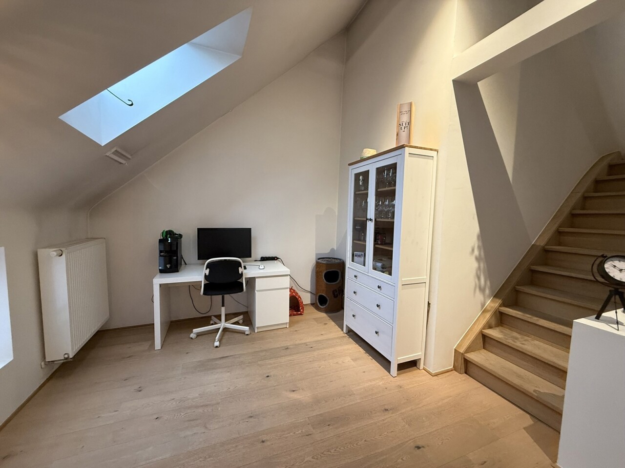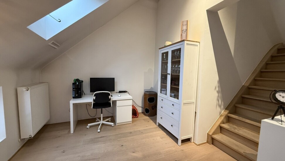 Trap naar de eerste verdieping met zithoek, gastentoilet, volledig ingerichte open keuken (met kasten, spoeltafel, oven, koelkast, keramische kookplaat, vaatwas...) met ontbijthoek en groot schuifraam naar het aangename terras van circa 25 m².