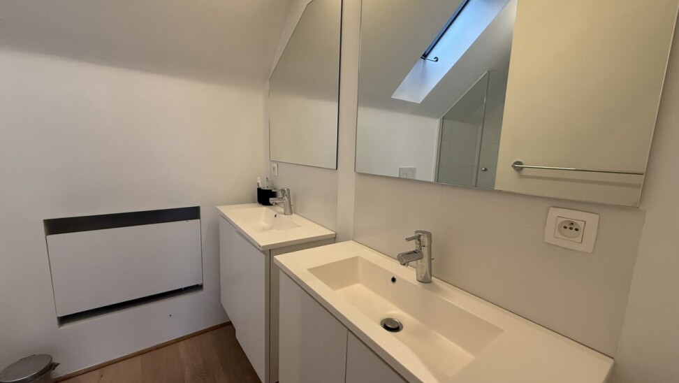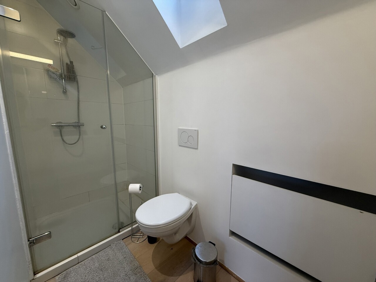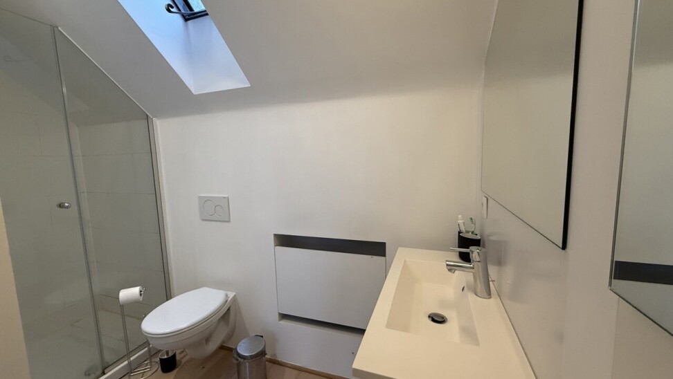 Trap naar de tweede verdieping met comfortabel ingerichte badkamer (toilet, douche en dubbel lavabomeubel) en één ruime slaapkamer.