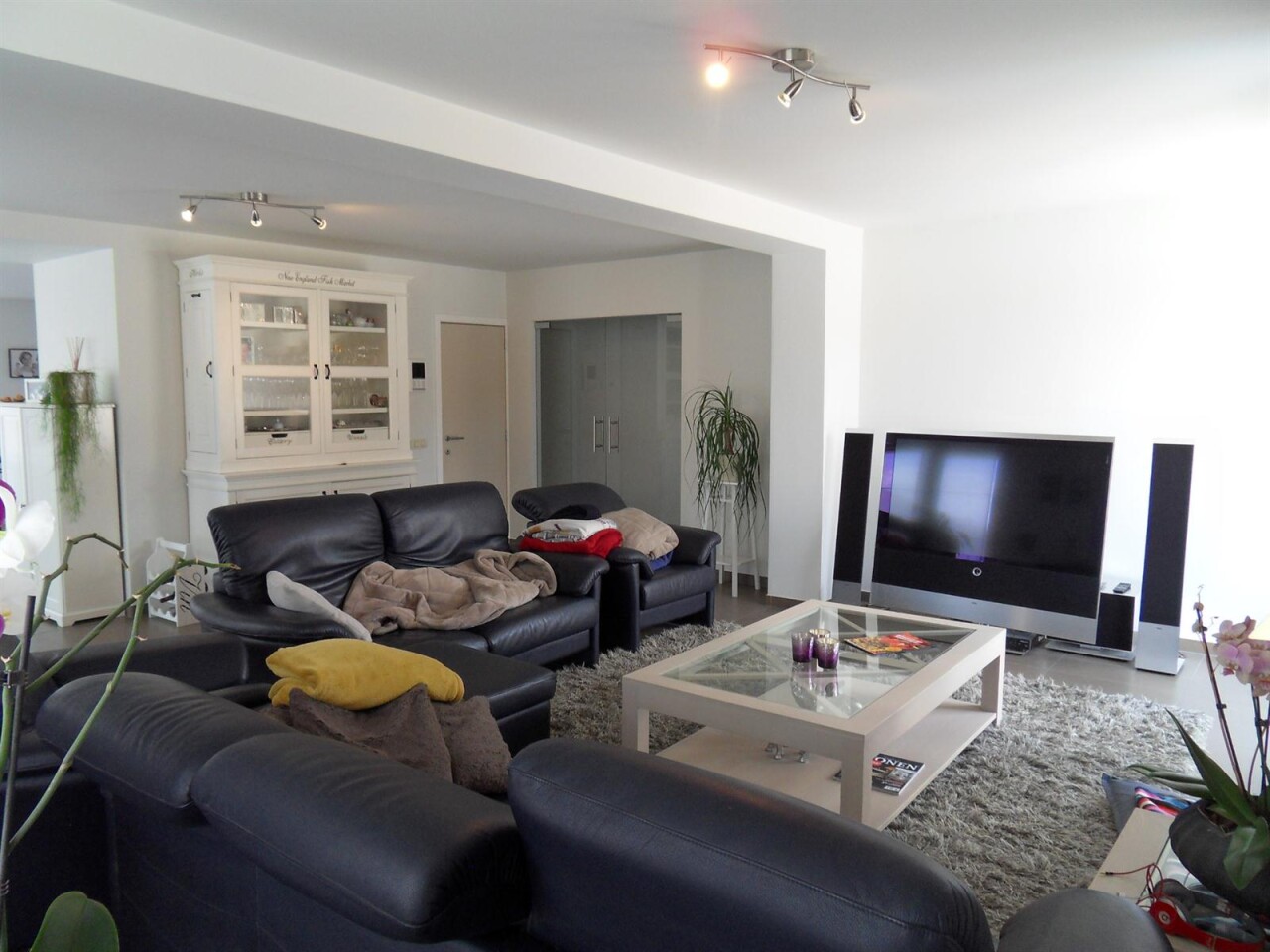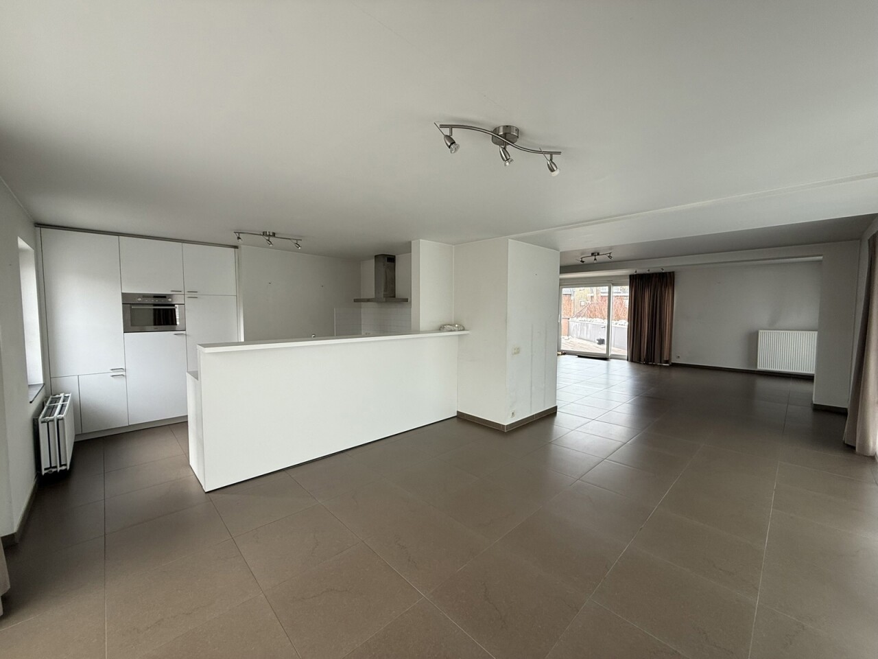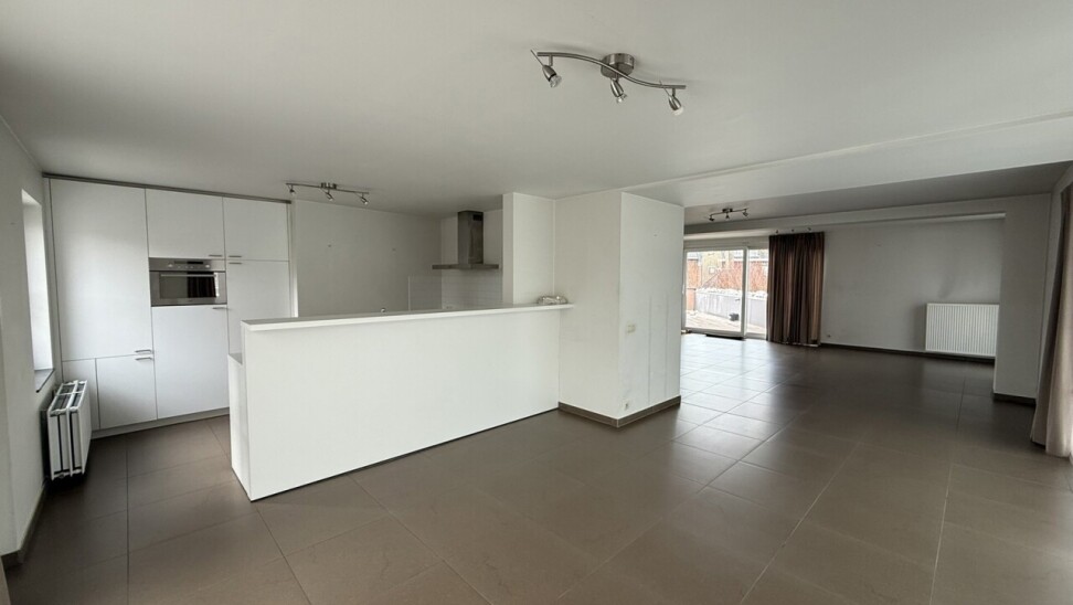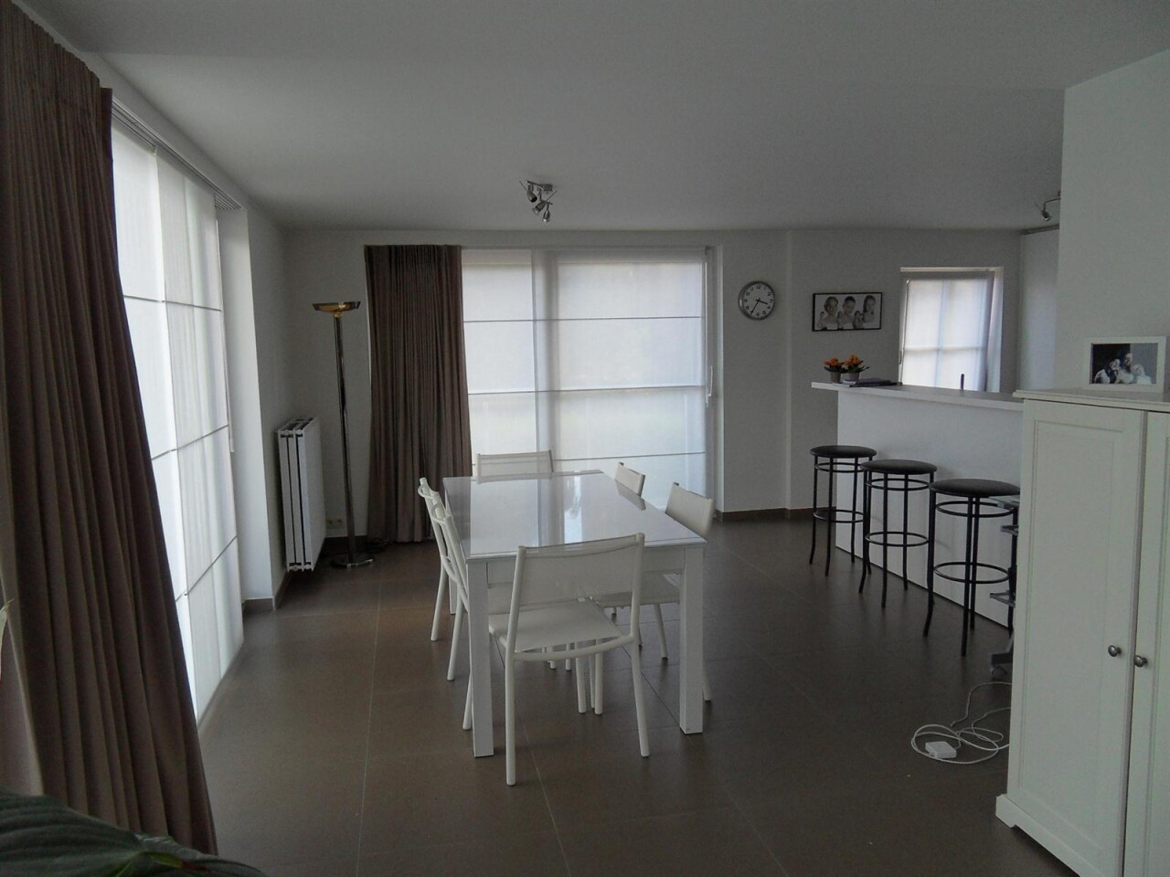 Eerste verdieping: de hall met vestiaire leidt naar het gastentoilet en een aparte bergruimte. Via een glazen tussendeur kom je in de ruime lichtrijke living. Achterin kom je via een schuifraam op het aangenaam ruime terras. Er is een volledig ingerichte open keuken (met vaatwasser, frigo, keramische kookplaat en ingemaakte kastwand) en ruimte voor een aansluitende eetplaats en ontbijthoek.