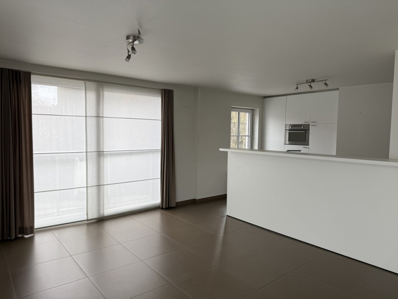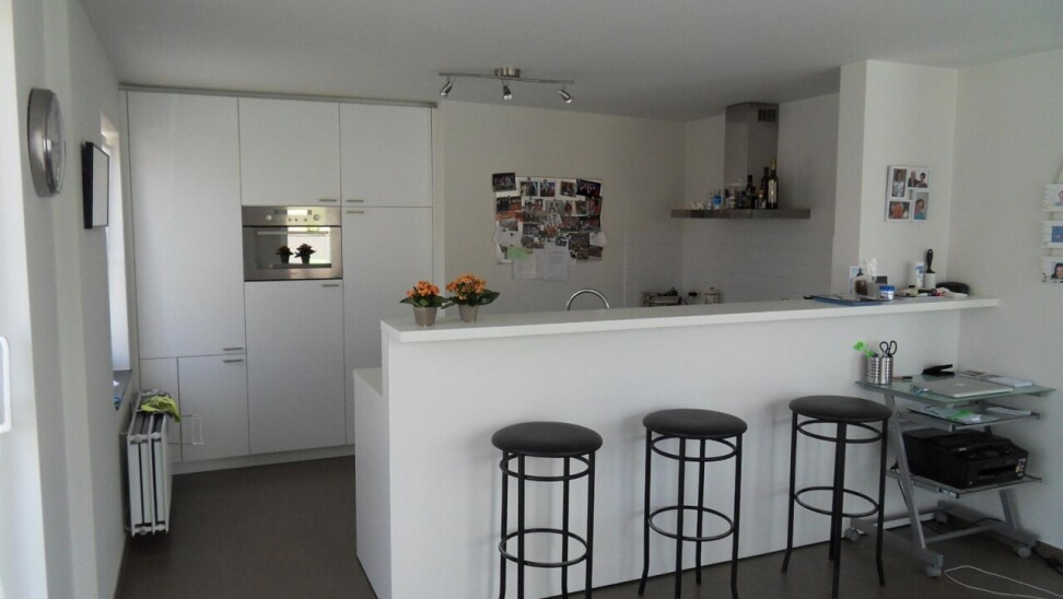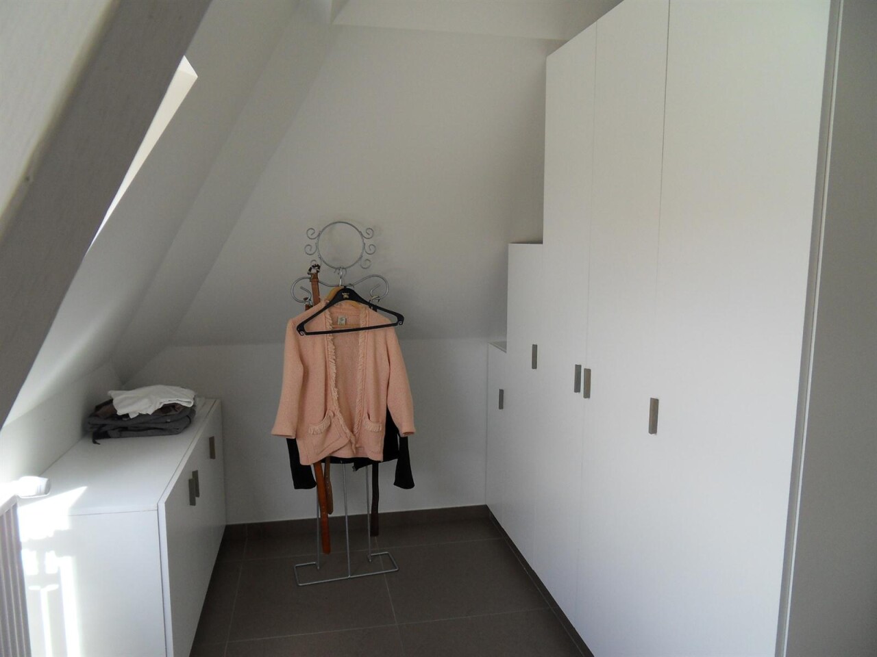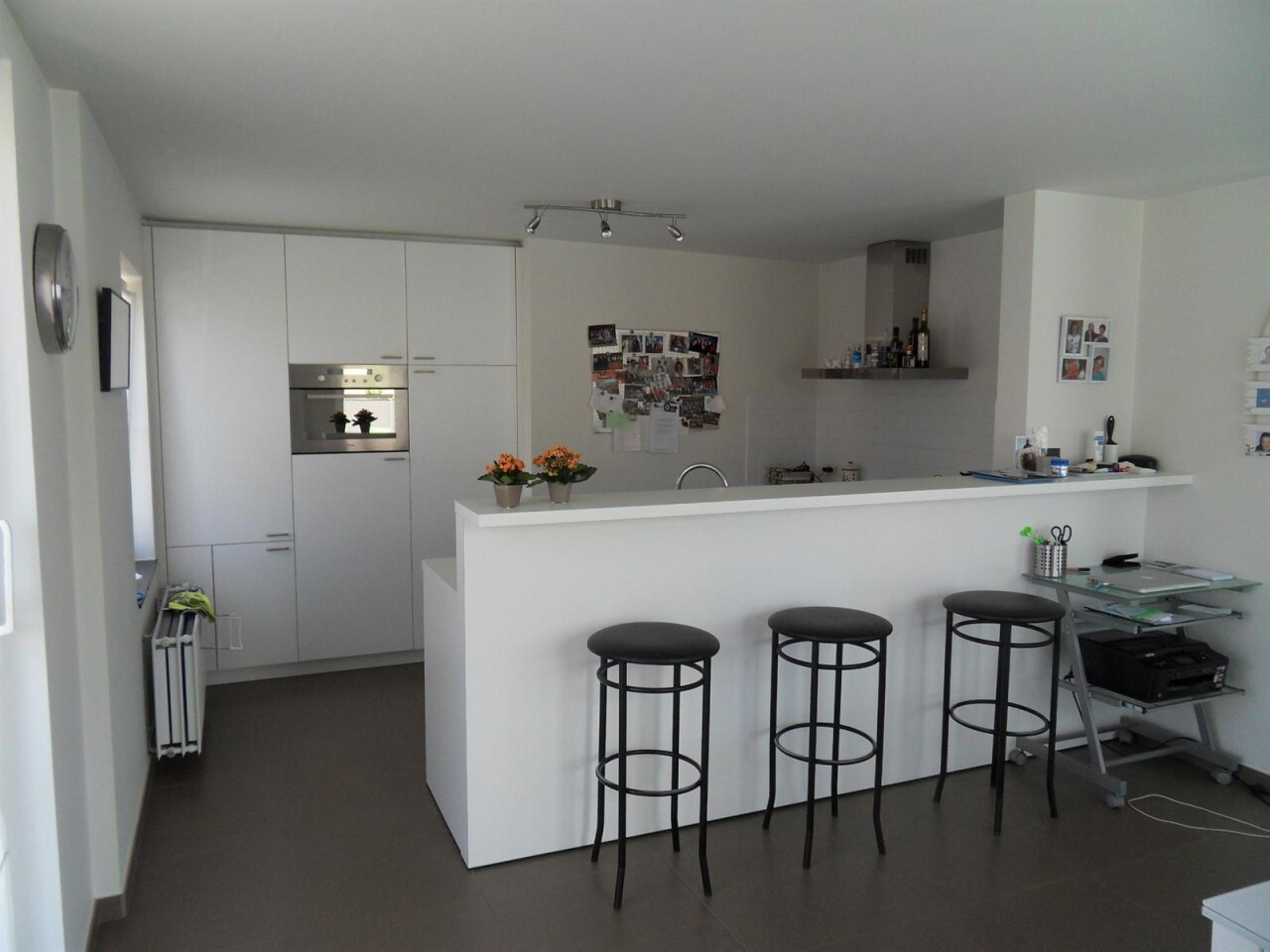 Eerste verdieping: de hall met vestiaire leidt naar het gastentoilet en een aparte bergruimte. Via een glazen tussendeur kom je in de ruime lichtrijke living. Achterin kom je via een schuifraam op het aangenaam ruime terras. Er is een volledig ingerichte open keuken (met vaatwasser, frigo, keramische kookplaat en ingemaakte kastwand) en ruimte voor een aansluitende eetplaats en ontbijthoek.