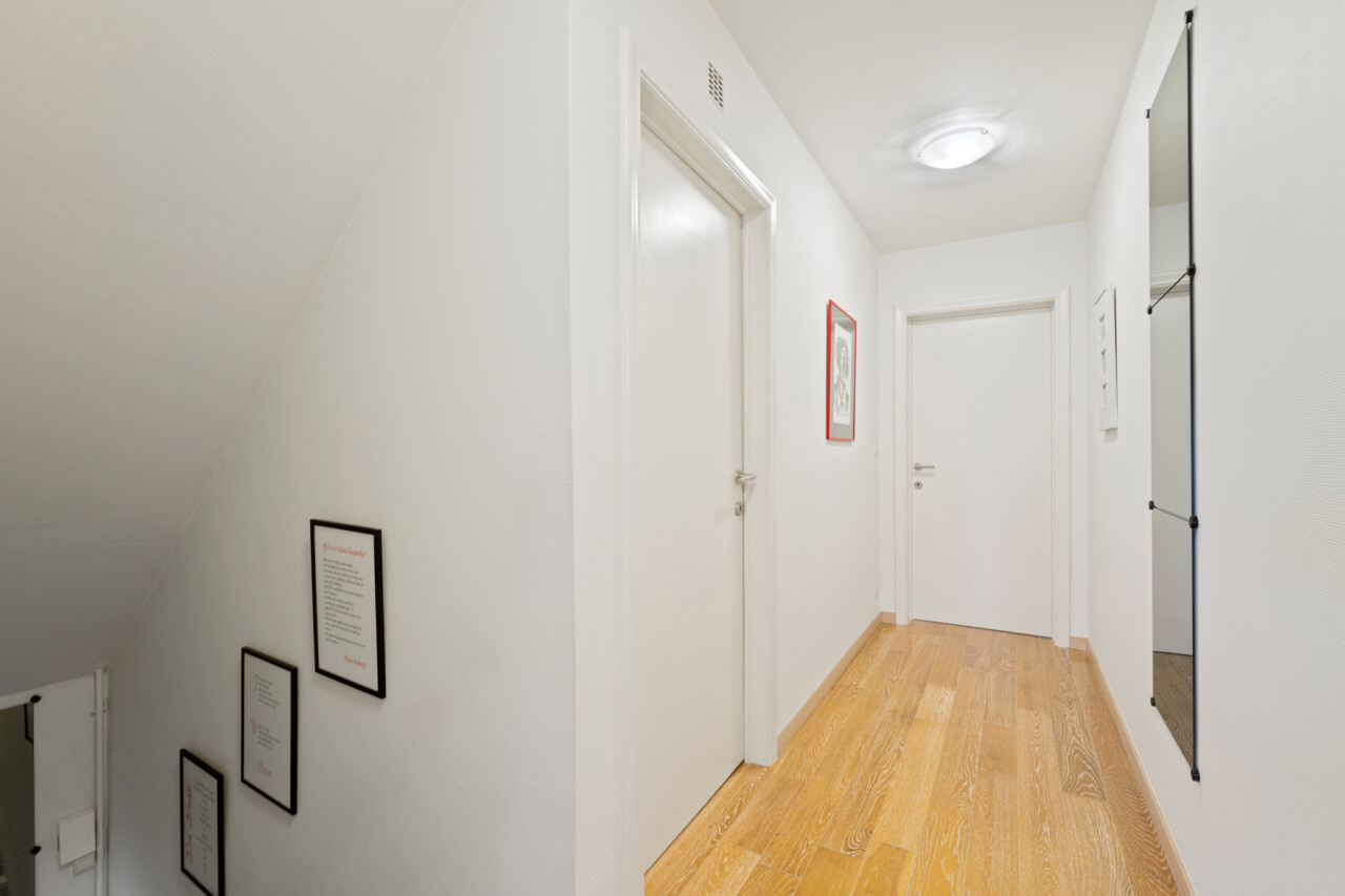 VERDIEPING: nachthall, living met gashaard, twee slaapkamers waarvan één met ingemaakte kasten, badkamer met lavabomeubel en spiegelkast, douche en toilet.