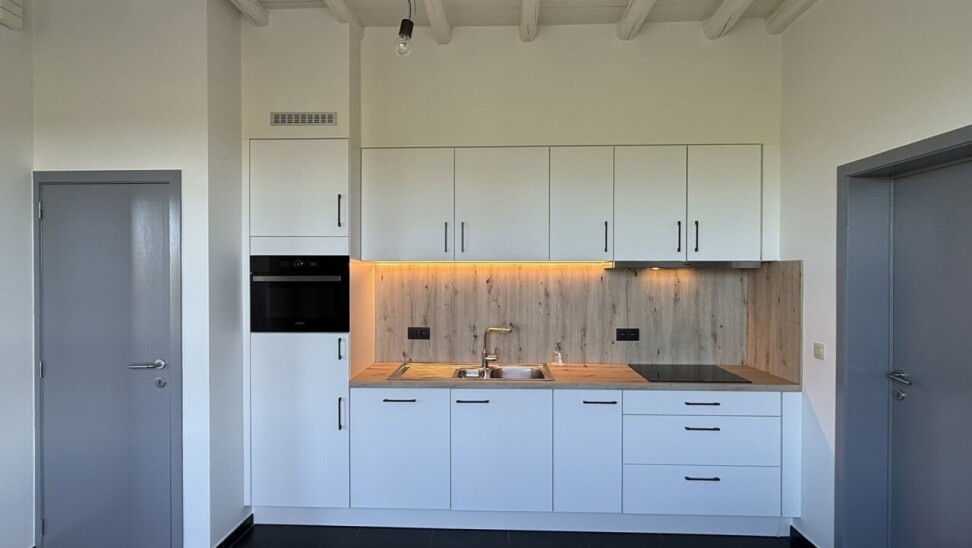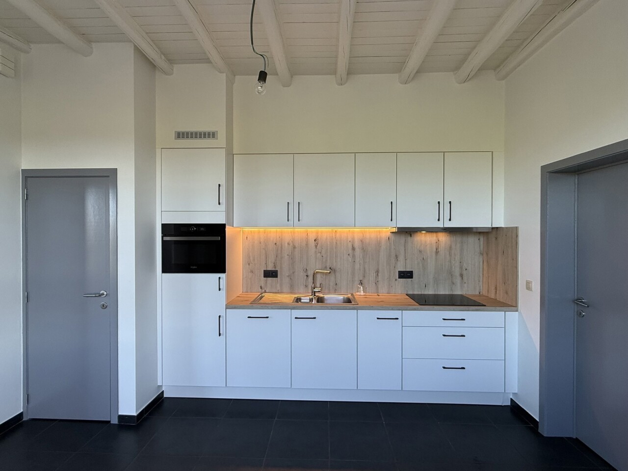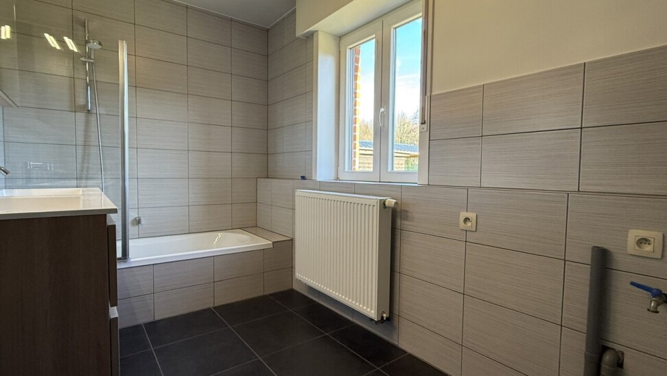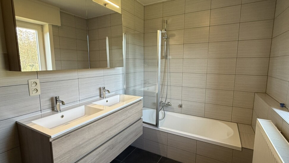 GELIJKVLOERS: lichtrijke leefruimte, glazen schuifdeur naar de volledig ingerichte keuken met ontbijthoek (maat kasten, frigo met diepvriesvak, keramische kookplaat, dampkap, combi-oven, vaatwasser...), gastentoilet, technische ruimte, ingerichte badkamer met douche in het bad en dubbel lavabomeubel, toegang tot de garage met automatische sectionaalpoort.