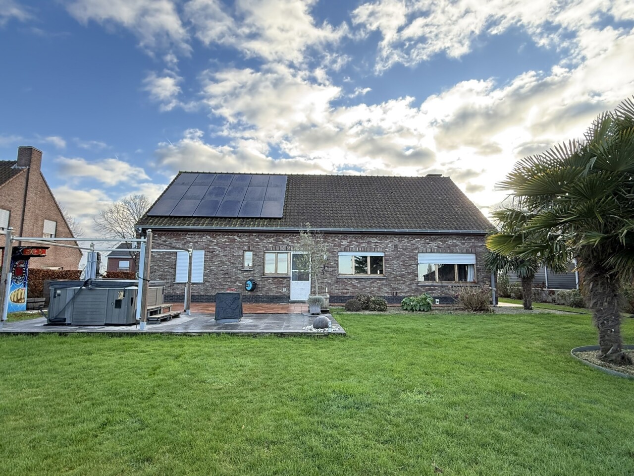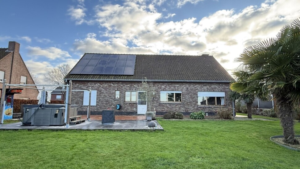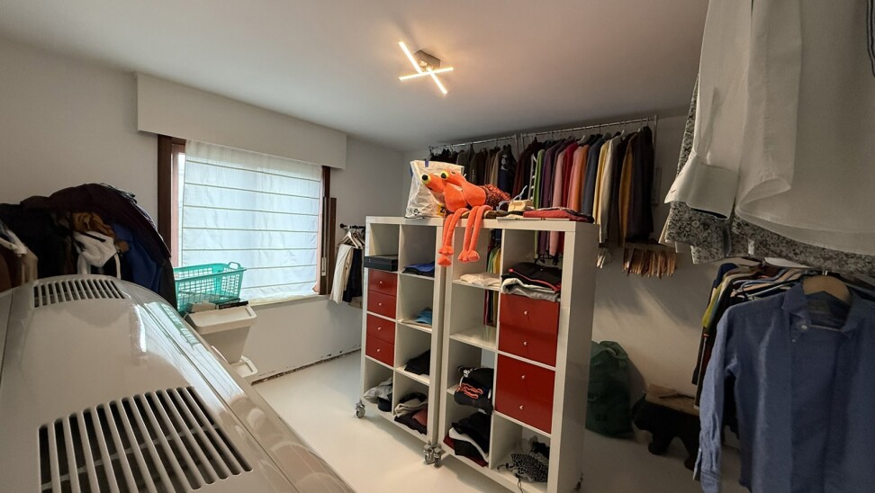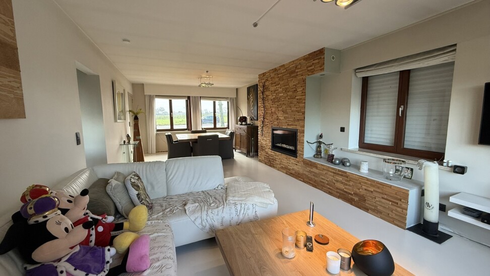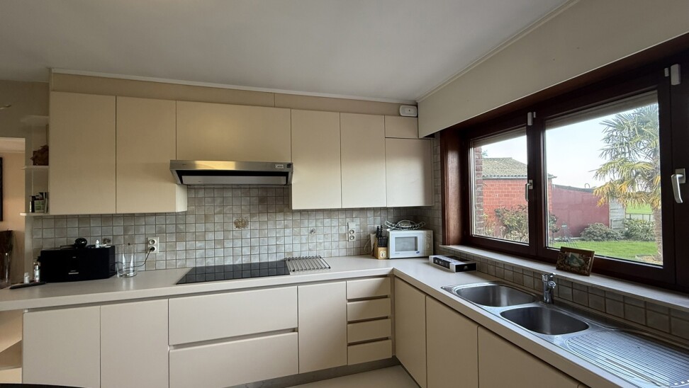 In de inkomhal kom je binnen in een ruime leefruimte met zithoek en eetplaats. De volledig ingerichte keuken is uitgerust met kasten, inductiekookplaat, oven, koelkast, vaatwasser en dampkap. Aansluitend vind je een handige voorraadruimte. Vanuit de keuken heb je ook toegang tot een berging met toilet en plaats voor een diepvries.