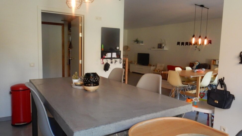 Hall met gastentoilet, grote leefruimte met volledig ingerichte open keuken met aansluitend berging/wasplaats en garage.