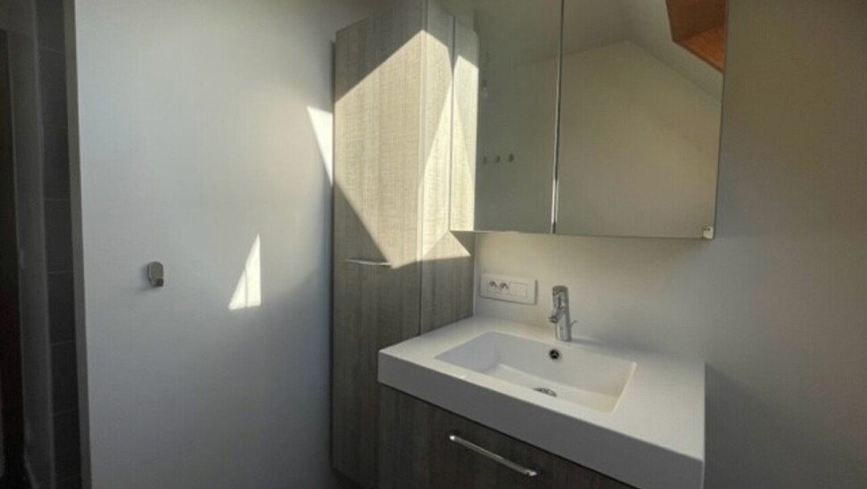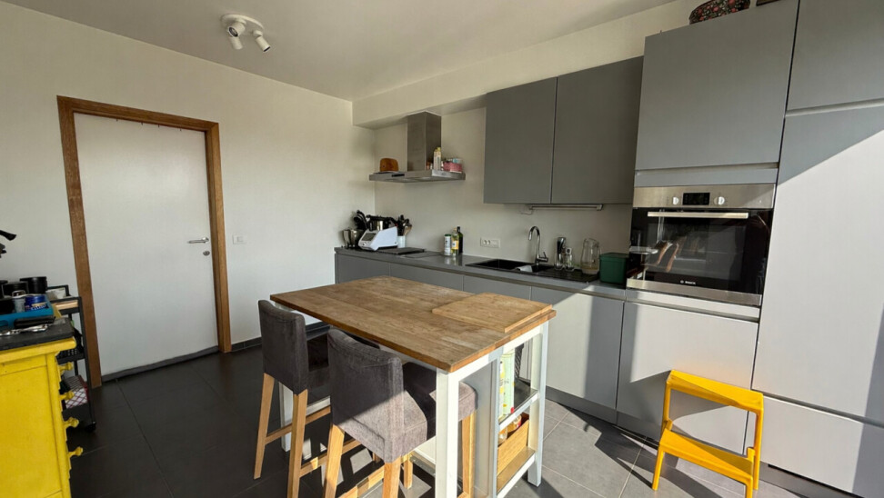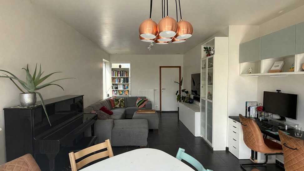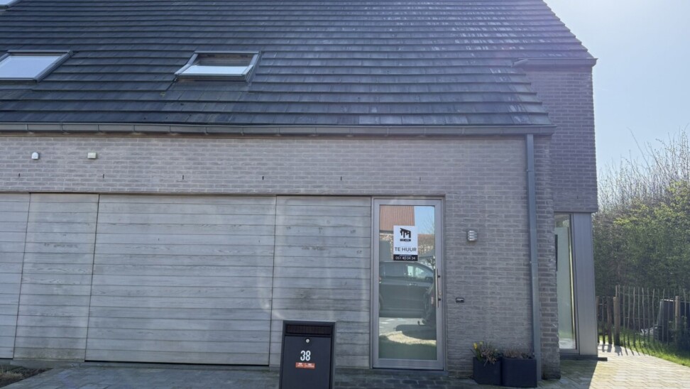 Gelijkvloers: inkom met gastentoilet, living met aangename lichtinval en aansluitend de ingerichte keuken (met dampkap, frigo, keramische kookplaat en oven) met ontbijthoek en de garage met wasplaats (automatische sectionaalpoort).