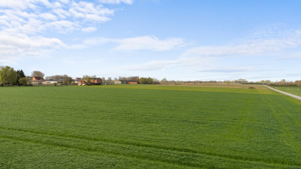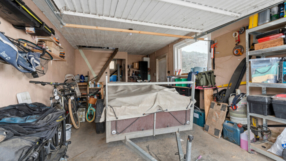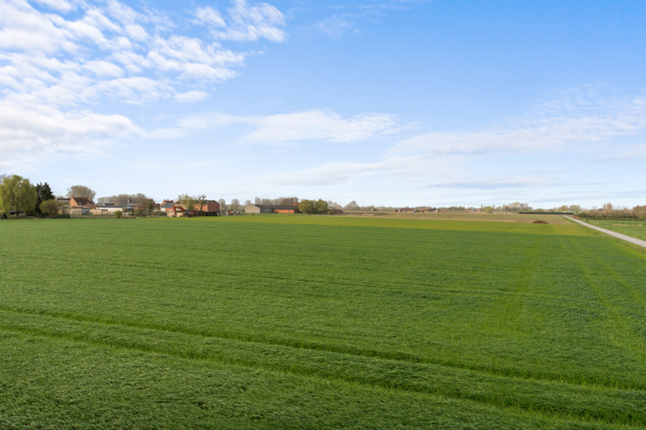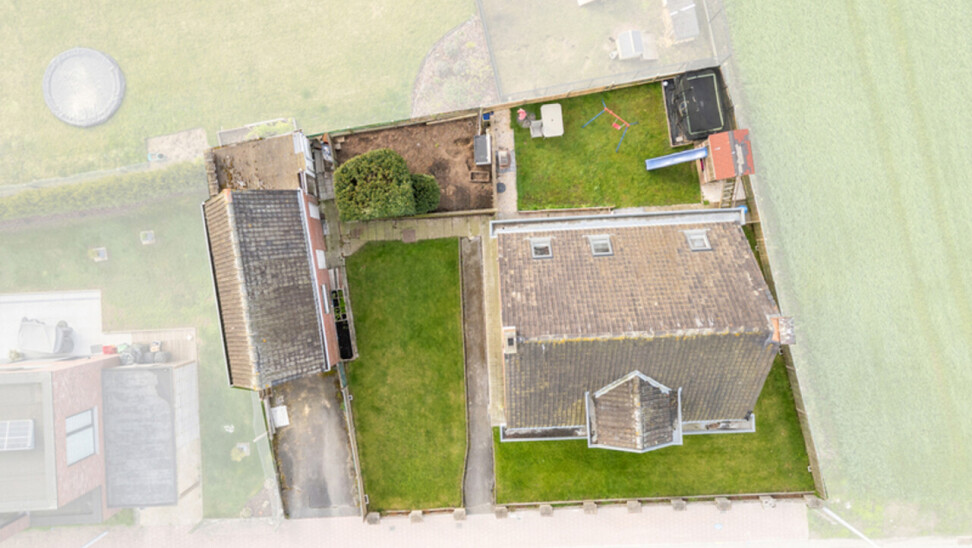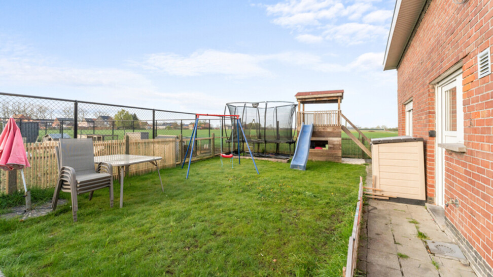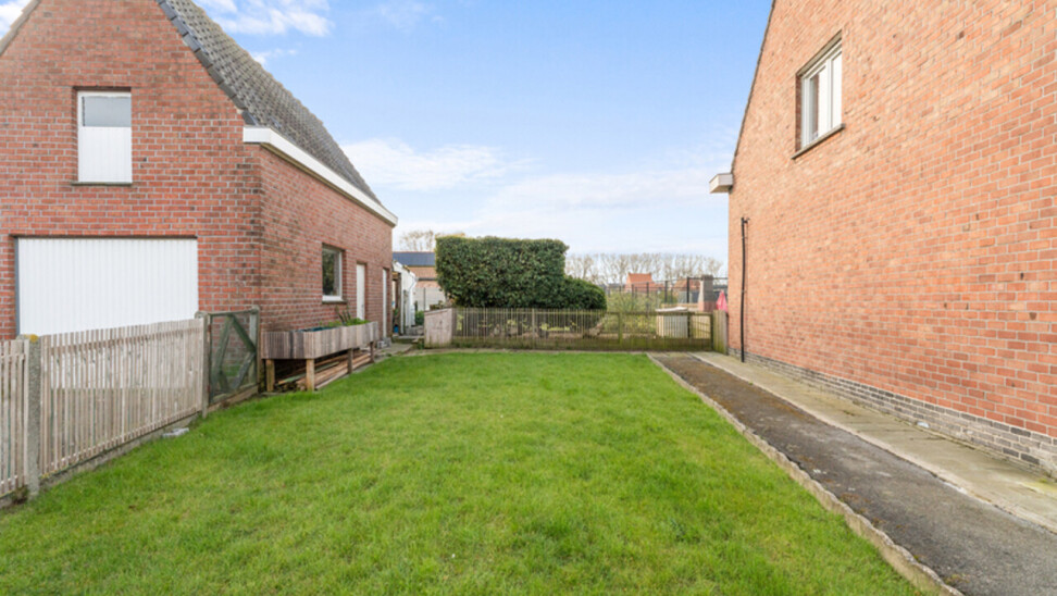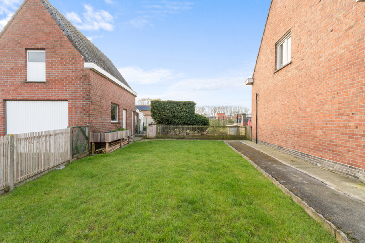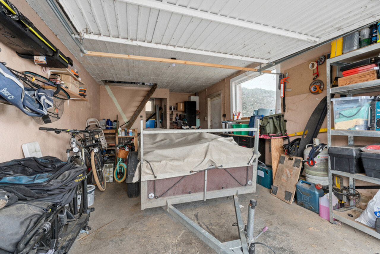 Zonnige tuin met open zicht. Er is een oprit met een aparte garage/berging met kantelpoort.