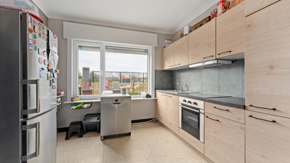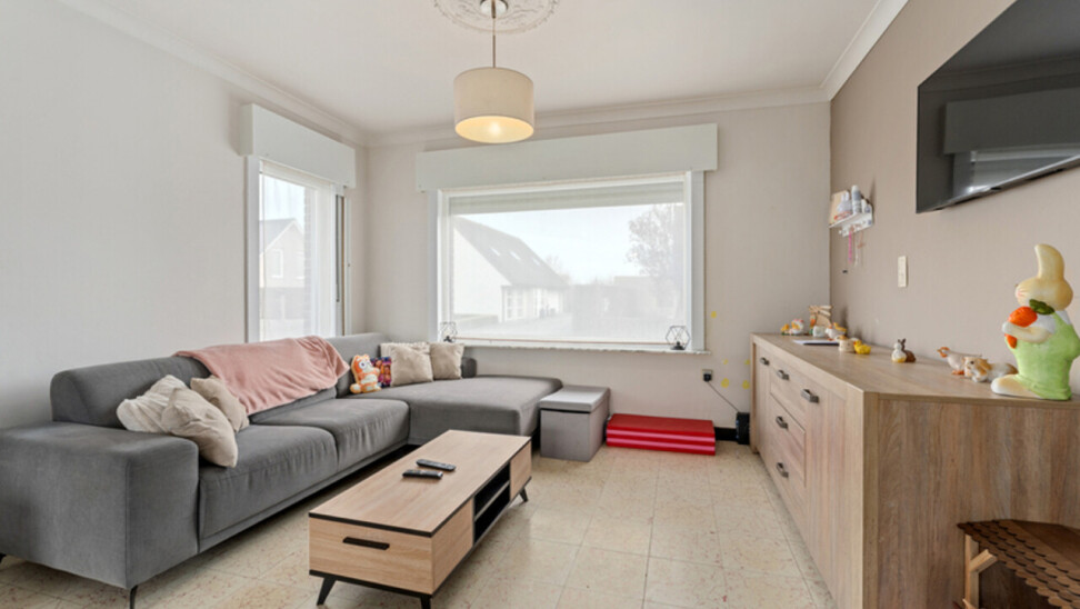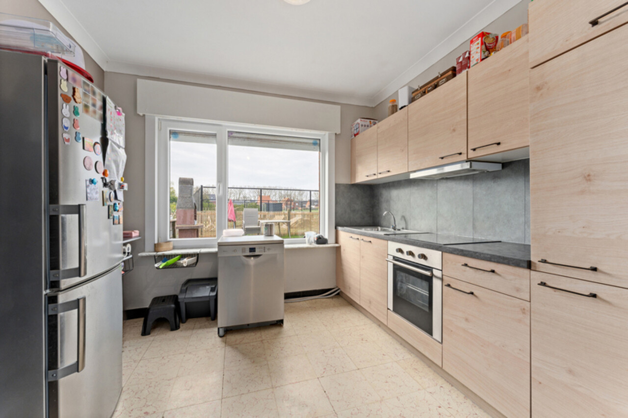 GELIJKVLOERS: inkom en toilet, voorplaats en aan de achterkant de ingerichte keuken (kasten, keramische kookplaat, dampkap, frigo,...). Rechts van de hall is er de ruime lichtrijke living.