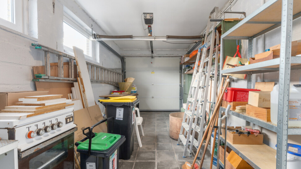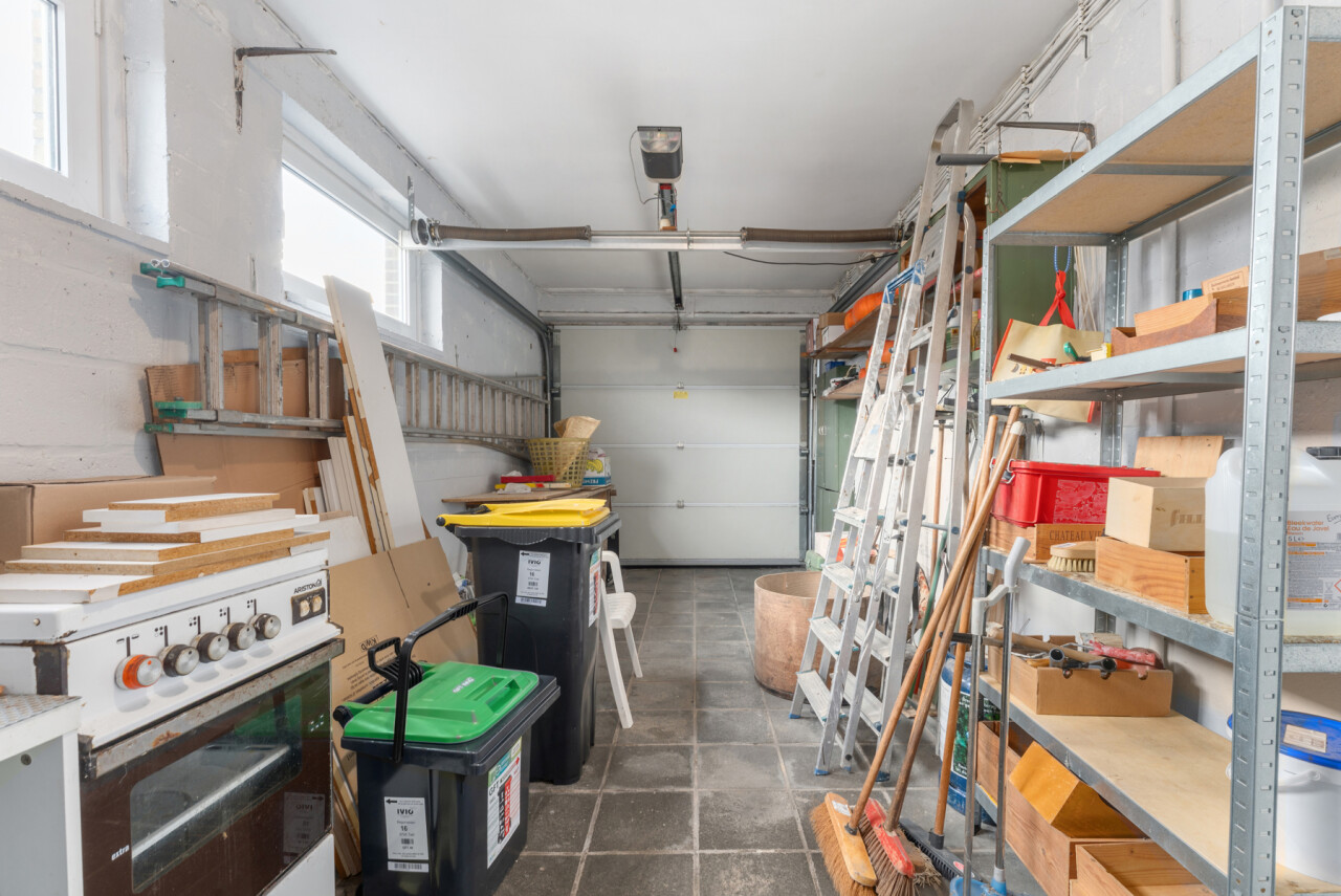 GELIJKVLOERS: inkom, gastentoilet, living met aansluitend veranda, ingerichte keuken en toegang tot de voorraadkelder en de garage met wasplaats en automatische sectionaalpoort.