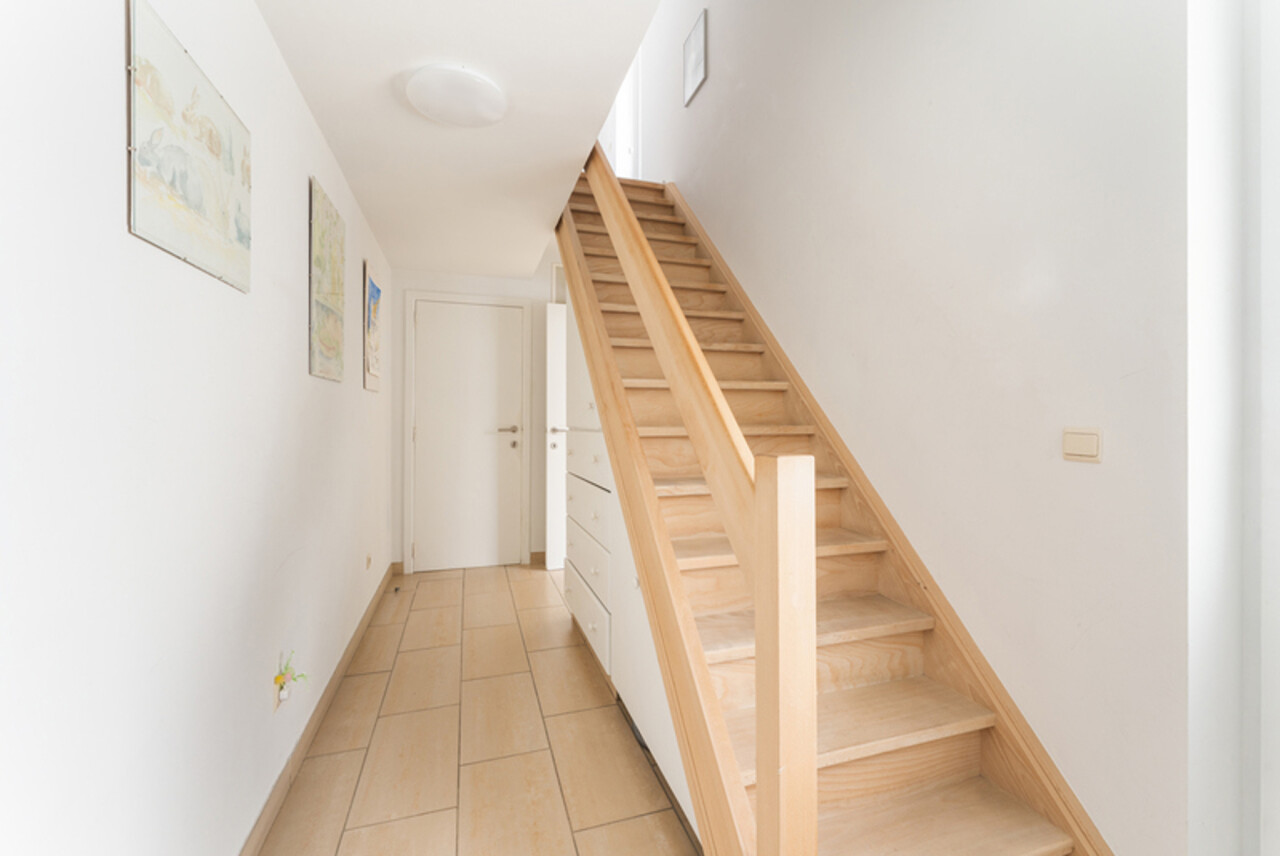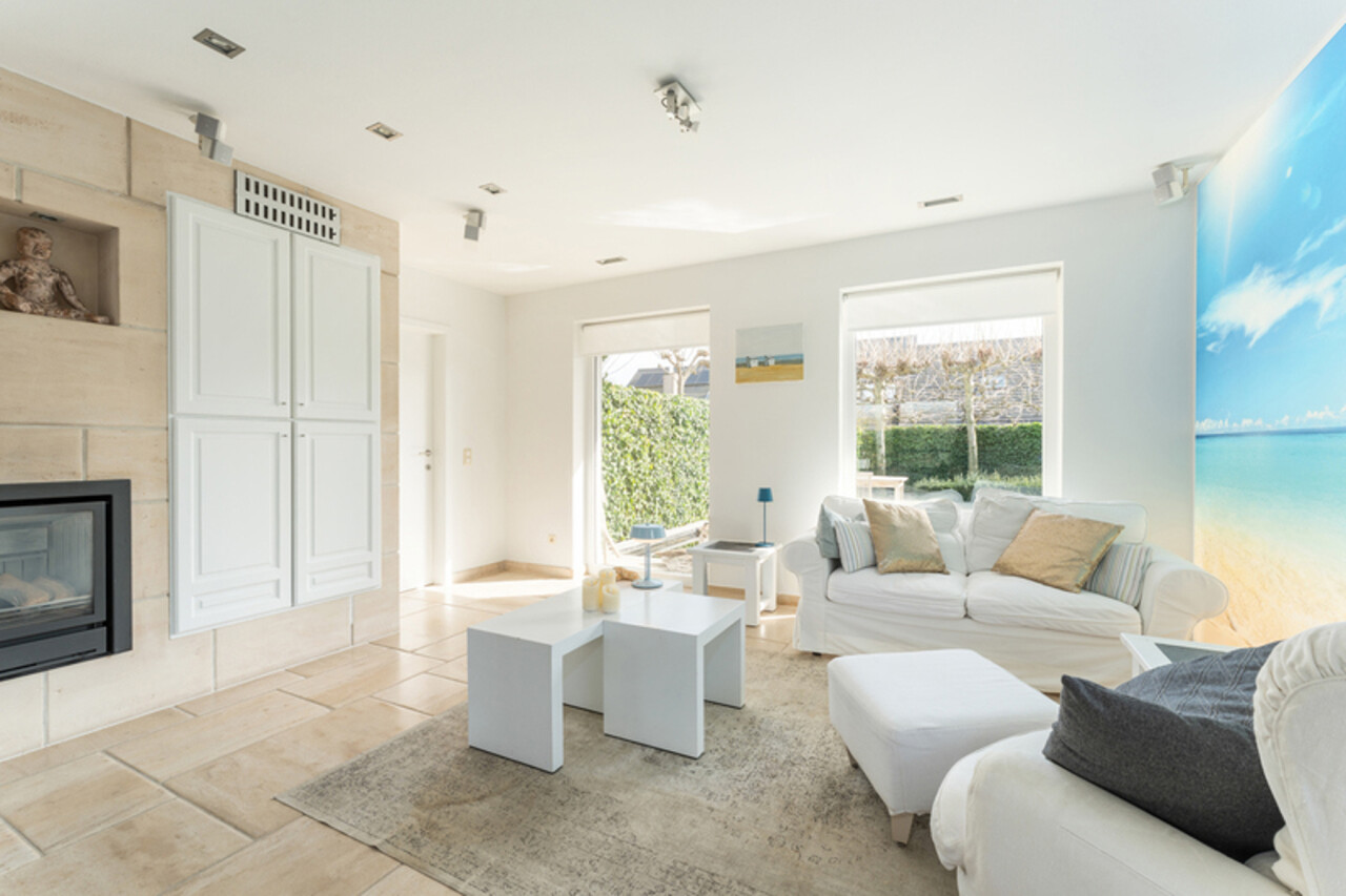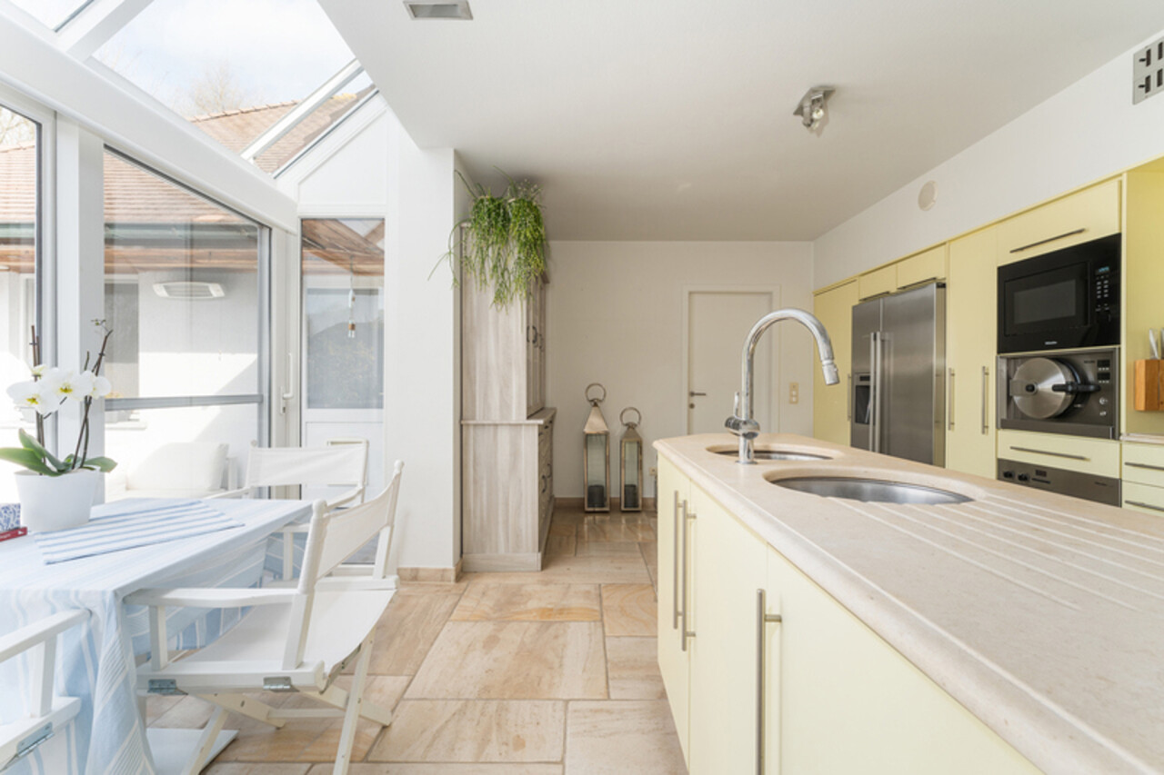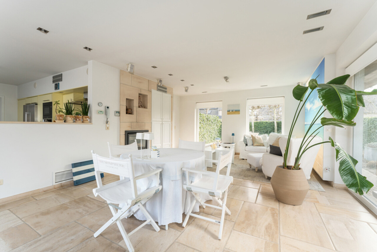 Inkomhal met ingemaakte vestiaire en gastentoilet. De lichtrijke leefruimte vormt het hart van het huis en sluit naadloos aan op de volledig ingerichte open keuken (met vaatwasser, oven, microgolf, stoomoven, keramische kookplaat, Amerikaanse frigo...) met ontbijthoek en een praktische aansluitende berging.