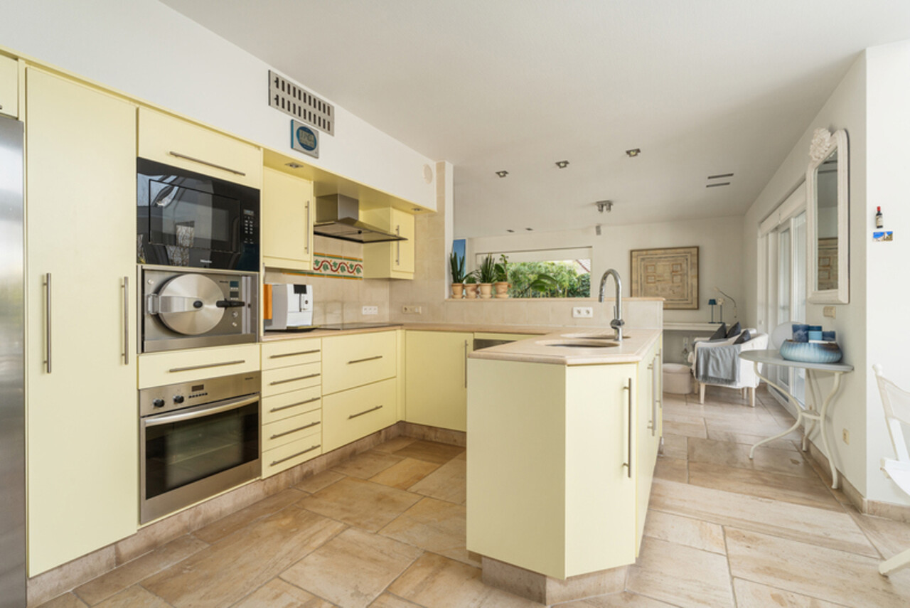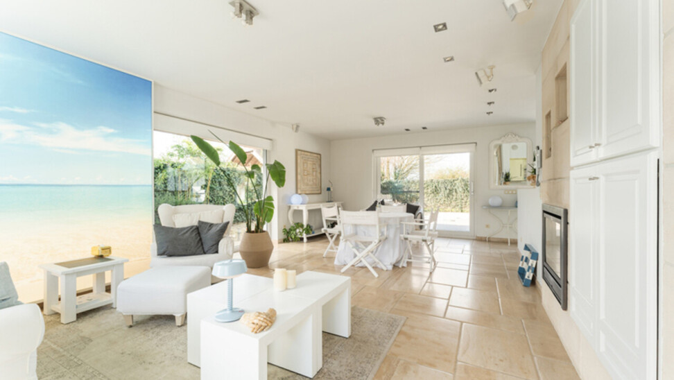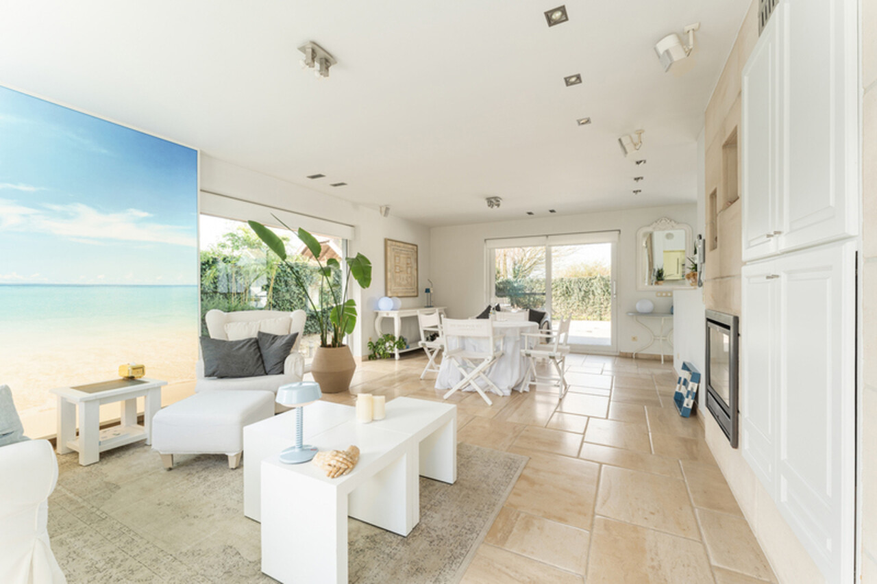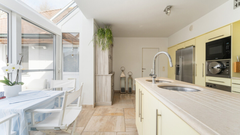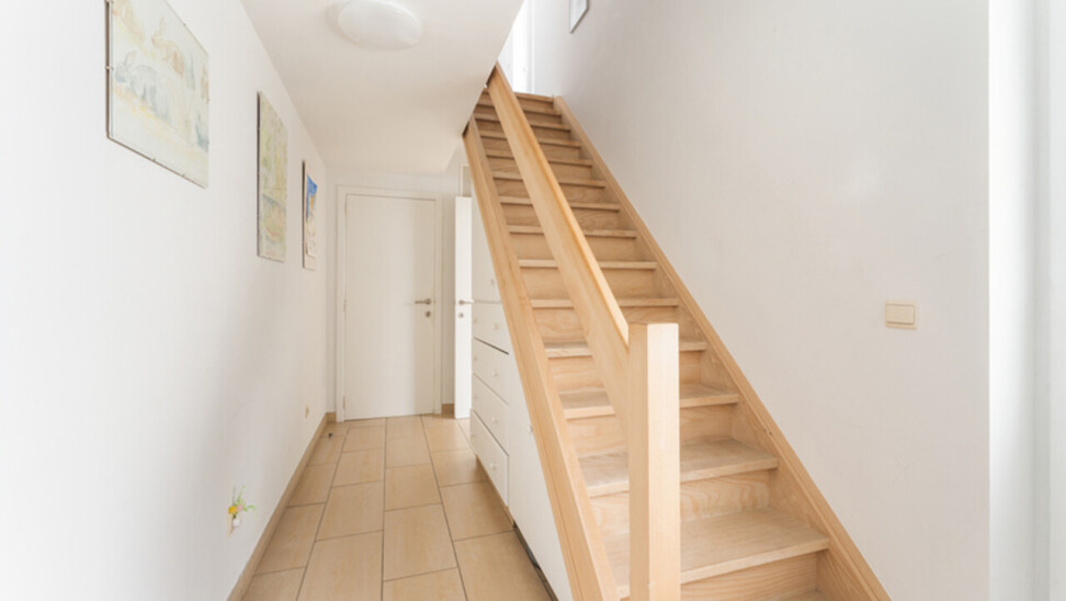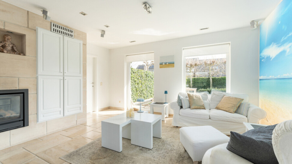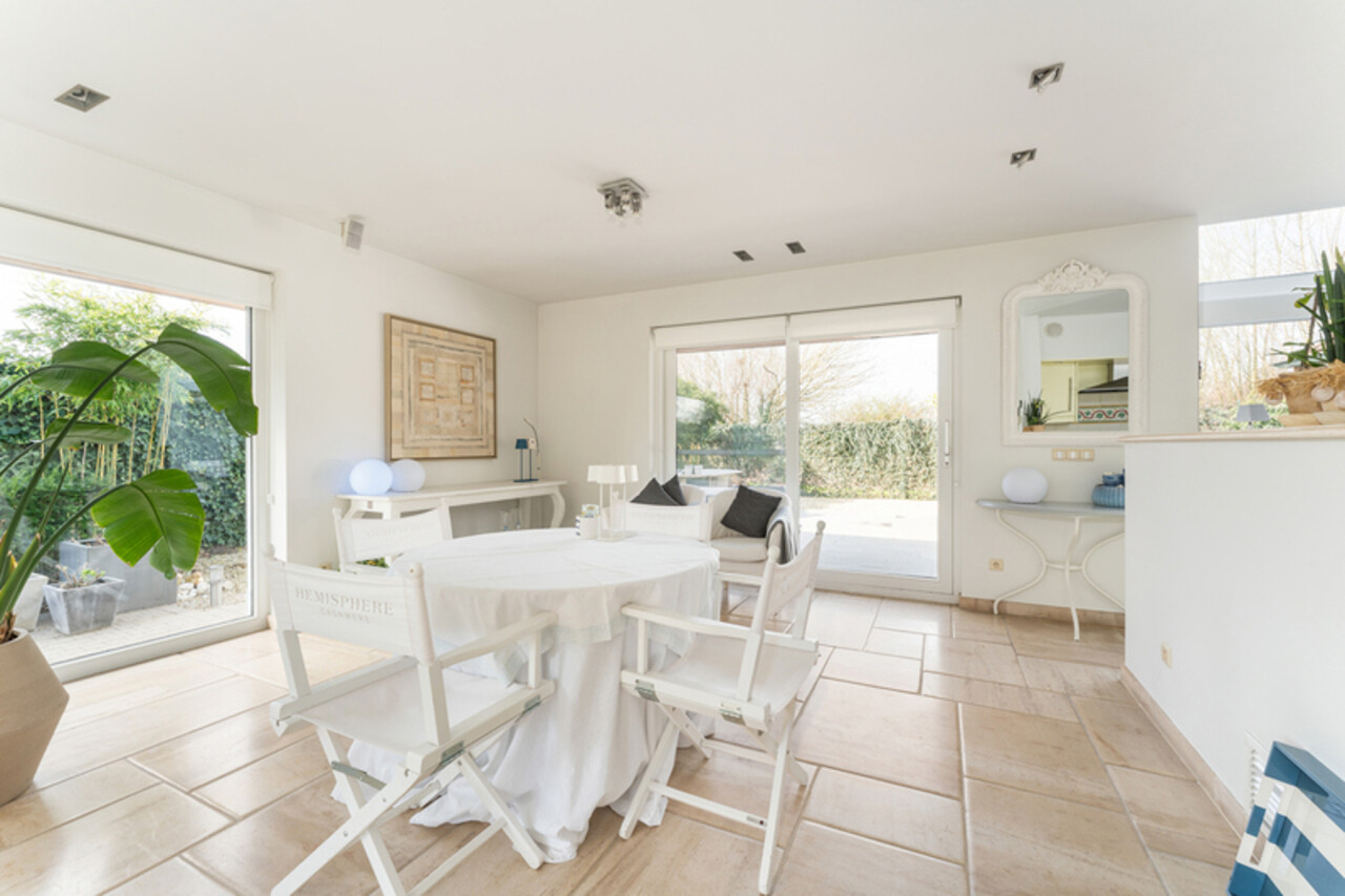 Inkomhal met ingemaakte vestiaire en gastentoilet. De lichtrijke leefruimte vormt het hart van het huis en sluit naadloos aan op de volledig ingerichte open keuken (met vaatwasser, oven, microgolf, stoomoven, keramische kookplaat, Amerikaanse frigo...) met ontbijthoek en een praktische aansluitende berging.