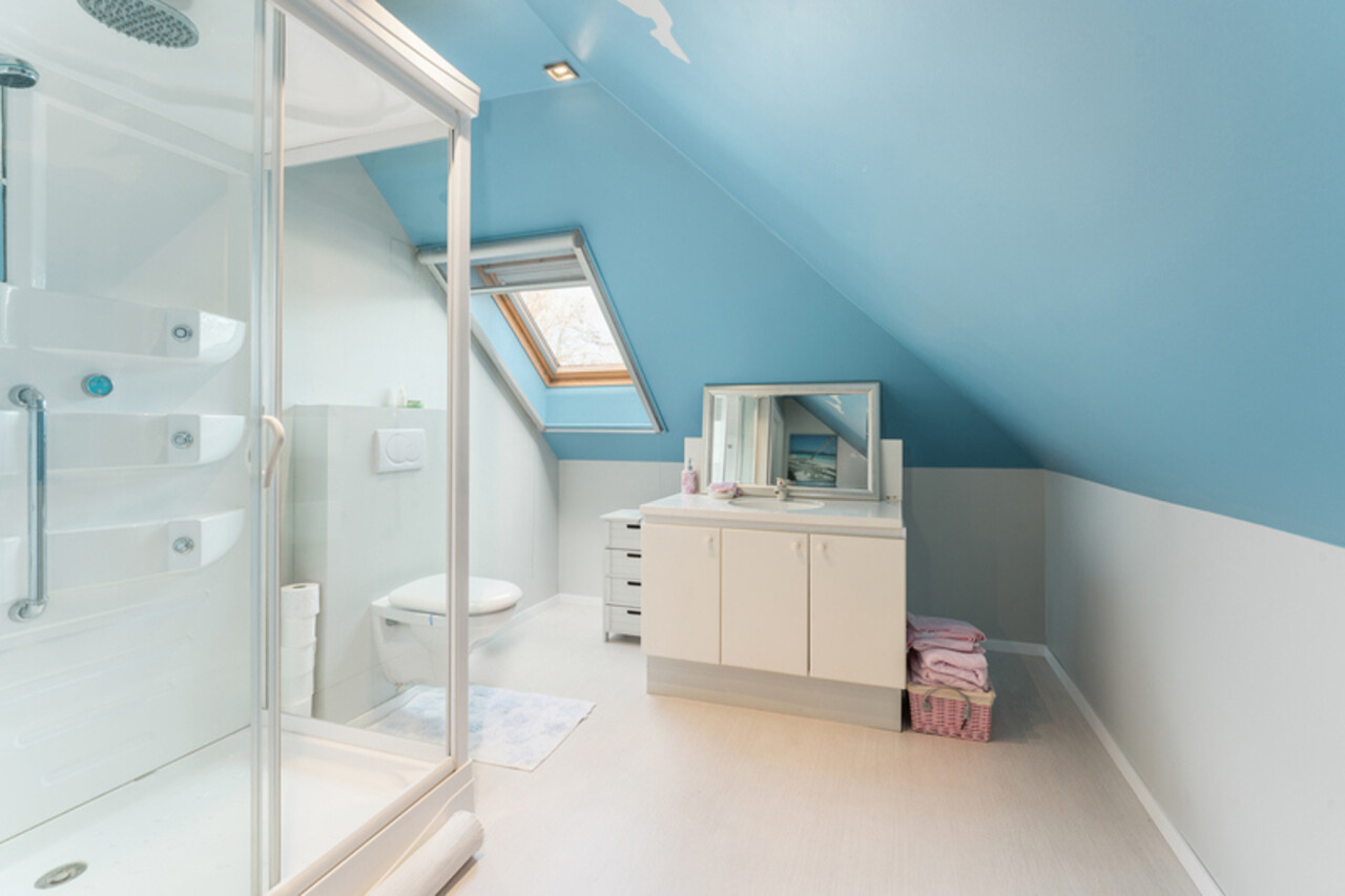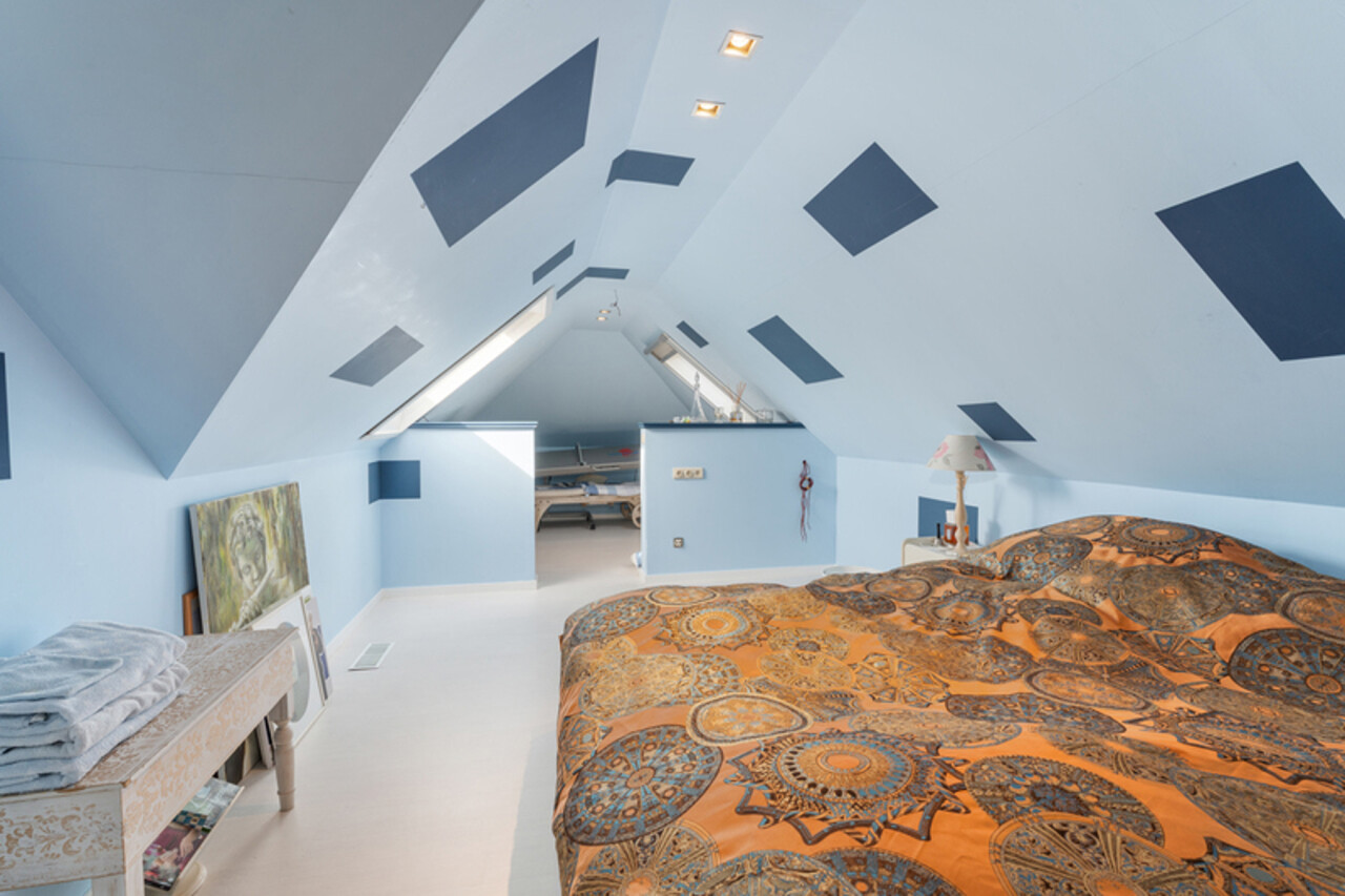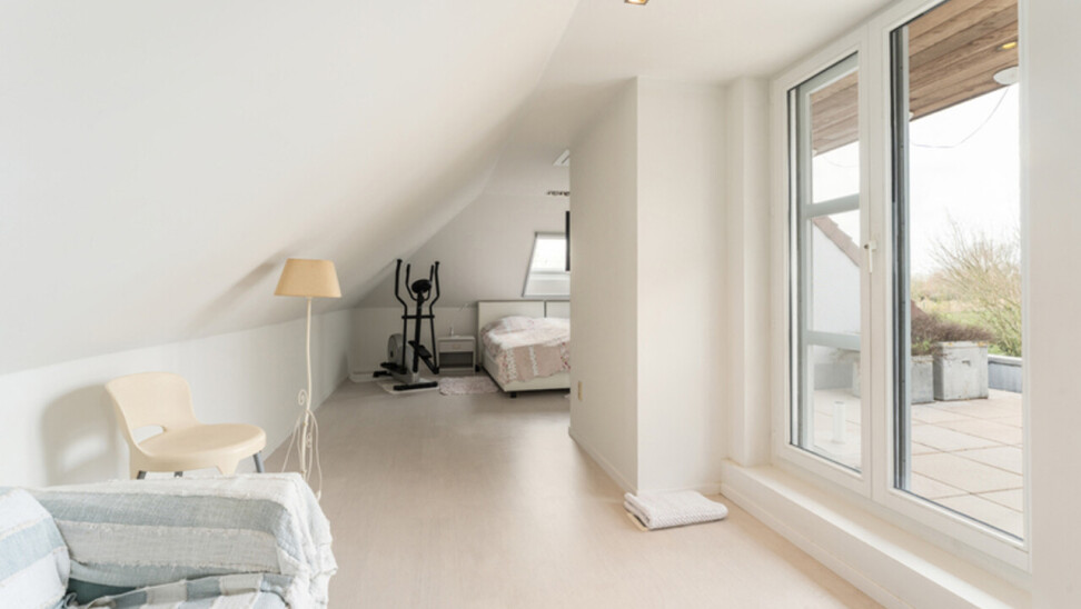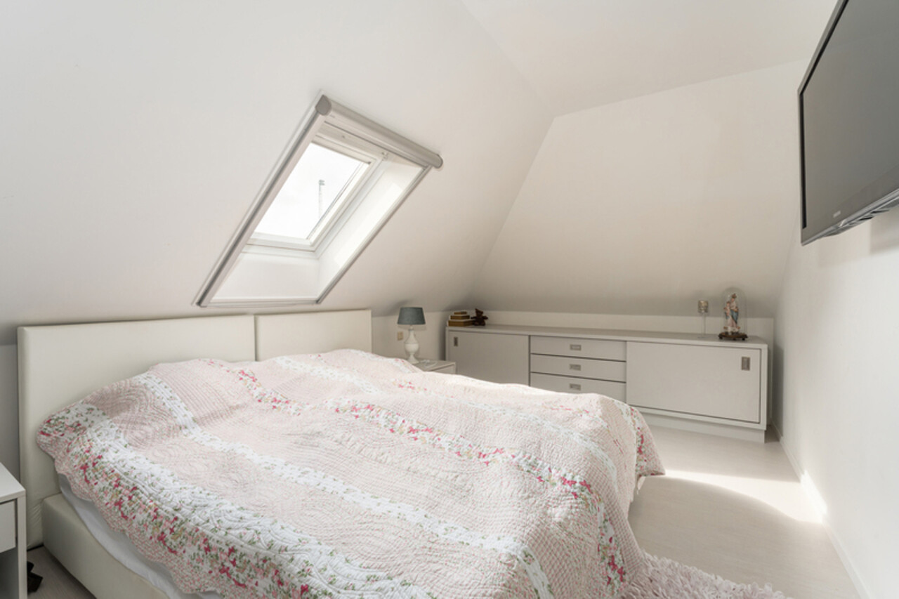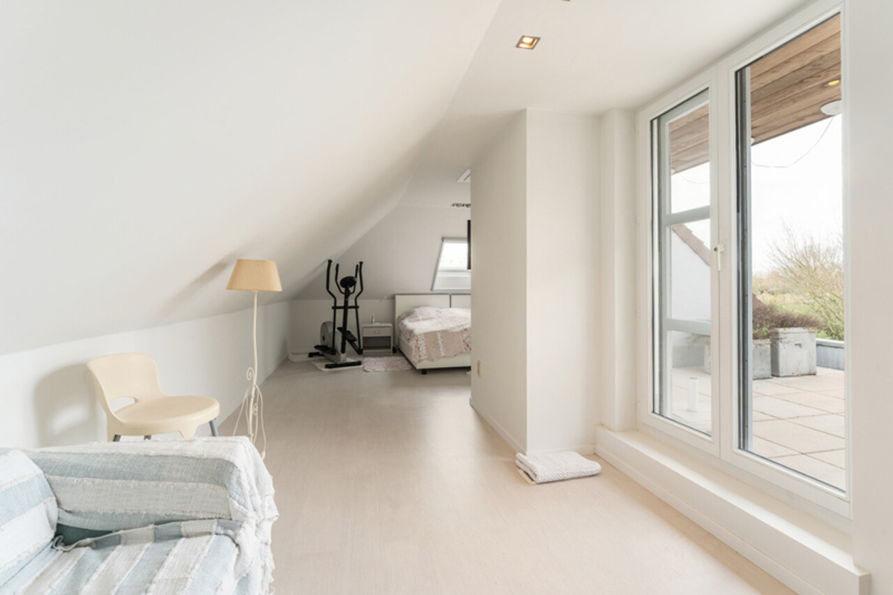 Op de verdieping, ingericht onder het dak, bevinden zich twee bijkomende ruime slaapkamers, waarvan één uitgeeft op een aangenaam zuidgericht terras. Ook hier is een tweede badkamer voorzien.