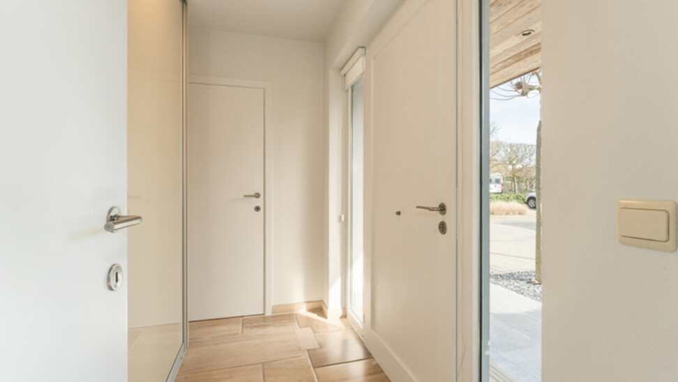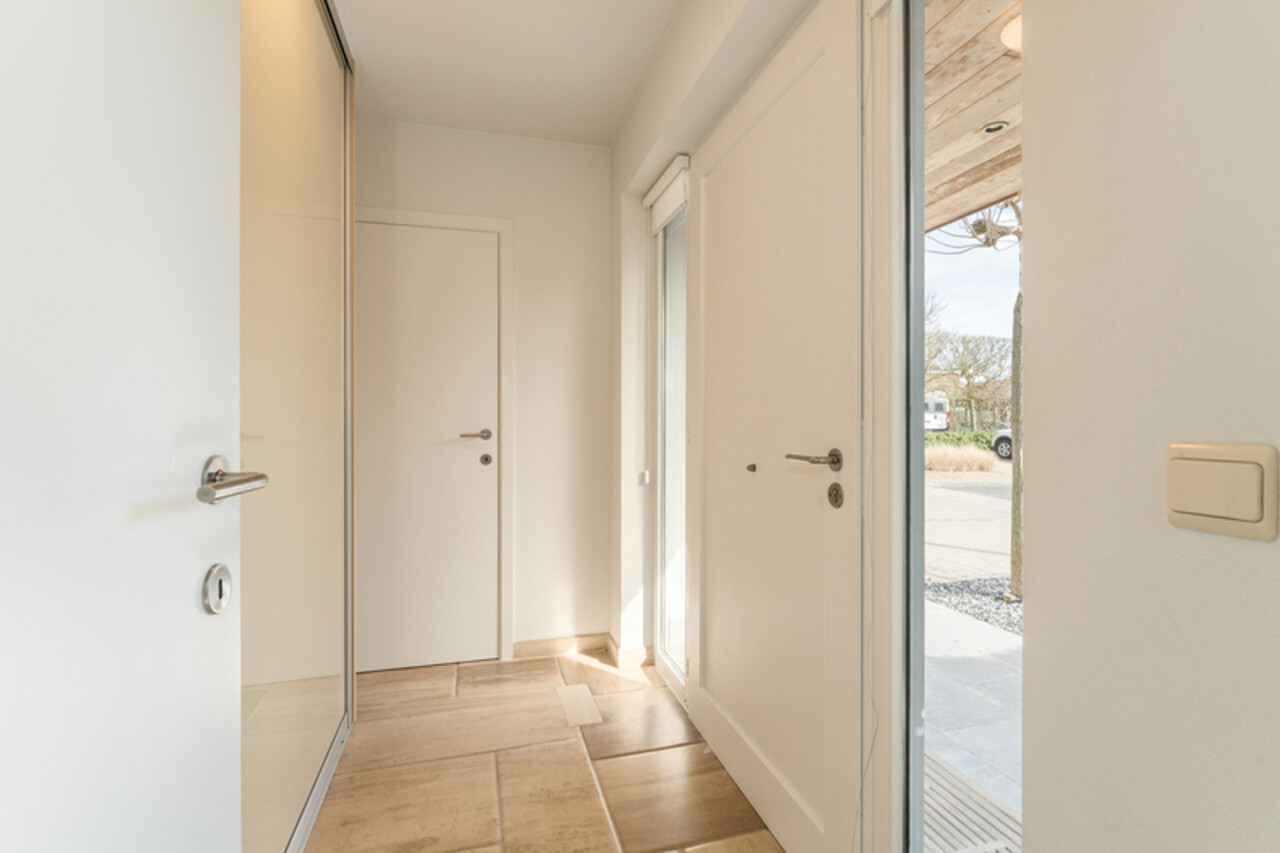 Naast de keuken bevindt zich een aparte nachthall die toegang geeft tot een bureelruimte en een eerste slaapkamer en een badkamer op het gelijkvloers — een indeling die perfect inspeelt op wonen en werken aan huis of levensloopbestendig wonen.
